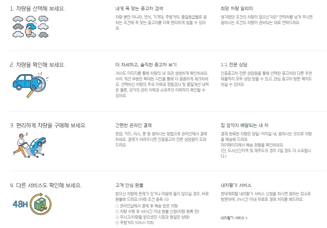 차량에 대한 투명한 정보 제공은 기본 누구에게나 동일한 파내 가격을 제시하는 정가 판매제를 도입했으며 오프라인샵 방문전 사전예약한 차량은 다른 고객에게 판매하지 않아 헛걸음 하는 일이 없도록 하는 점도 장점입니다. 여기에 품질보증수리가 준비되어 있어 구매 이후 관리까지 철저합니다.
