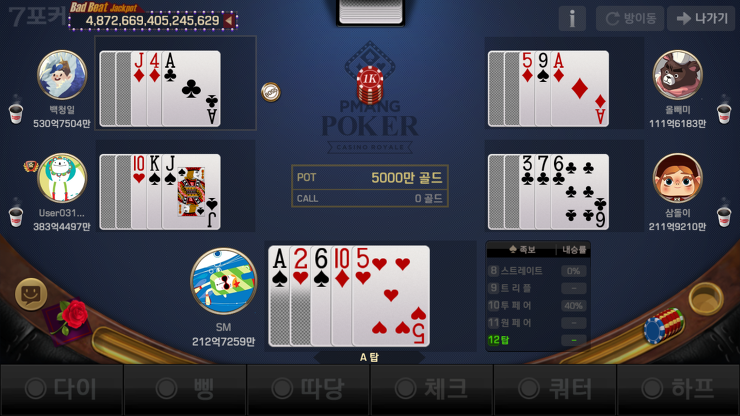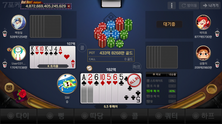 두근거리는 마음으로 마지막 카드를 열어보았습니다. 트리플까지는 아니더라도 투페어를 완성해 해볼만 하다는 생각이 들어 마지마 승부수를 걸었는데요, 아쉽게도 한단계 높은 족보를 완성한 다른 유저에게 발목을 잡히는 상황이 연출되었습니다. 상대 유저는 풀하우스나 포카드를 기대했을 것 같은데 이래저래 아쉬운 상황이더군요.