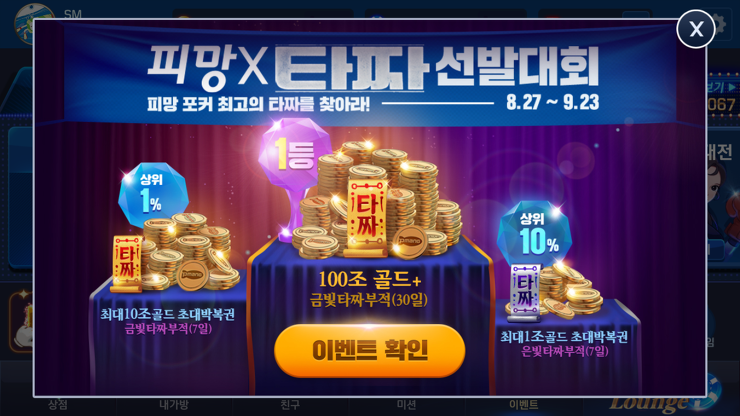 순간의 짜릿함과 긴장감이 최고조에 이르는 피망포커에서는 풍성한 이벤트도 진행되고 있습니다. 현재 타짜 원아이드잭 콜라보레이션을 기념한 피망X타짜 선발대회가 진행 중인데요, 인게임에서 사용 가능한 게임머니를 최대 100조까지 지급받고, 금빛 타짜부적까지 획득 할 수 있으니 서둘러 참여 행운의 주인공이 되어보시기 바랍니다!