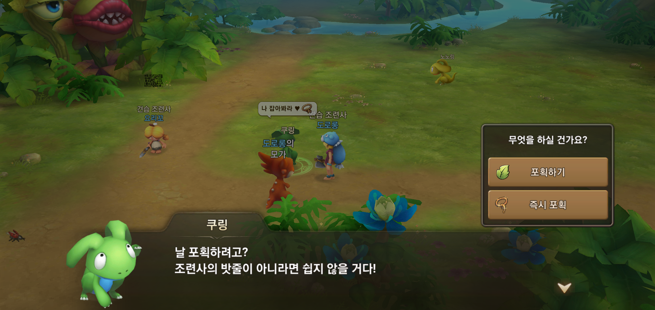 필드 곳곳에서 보이는 펫들 중 원하는 펫이 있다면 포획하기와 즉시포획 두가지 방법으로 진행할 수 있습니다. 펫을 포획할때 체력을 빼면서 타이밍에 맞춰 포획해야 하는 방식인데 가만히 포획당하는 녀석들이 아닌터라 도망가는 것도 막아야 하고, 여러 펫이 등장할 경우 우선순위를 두는것도 중요합니다.