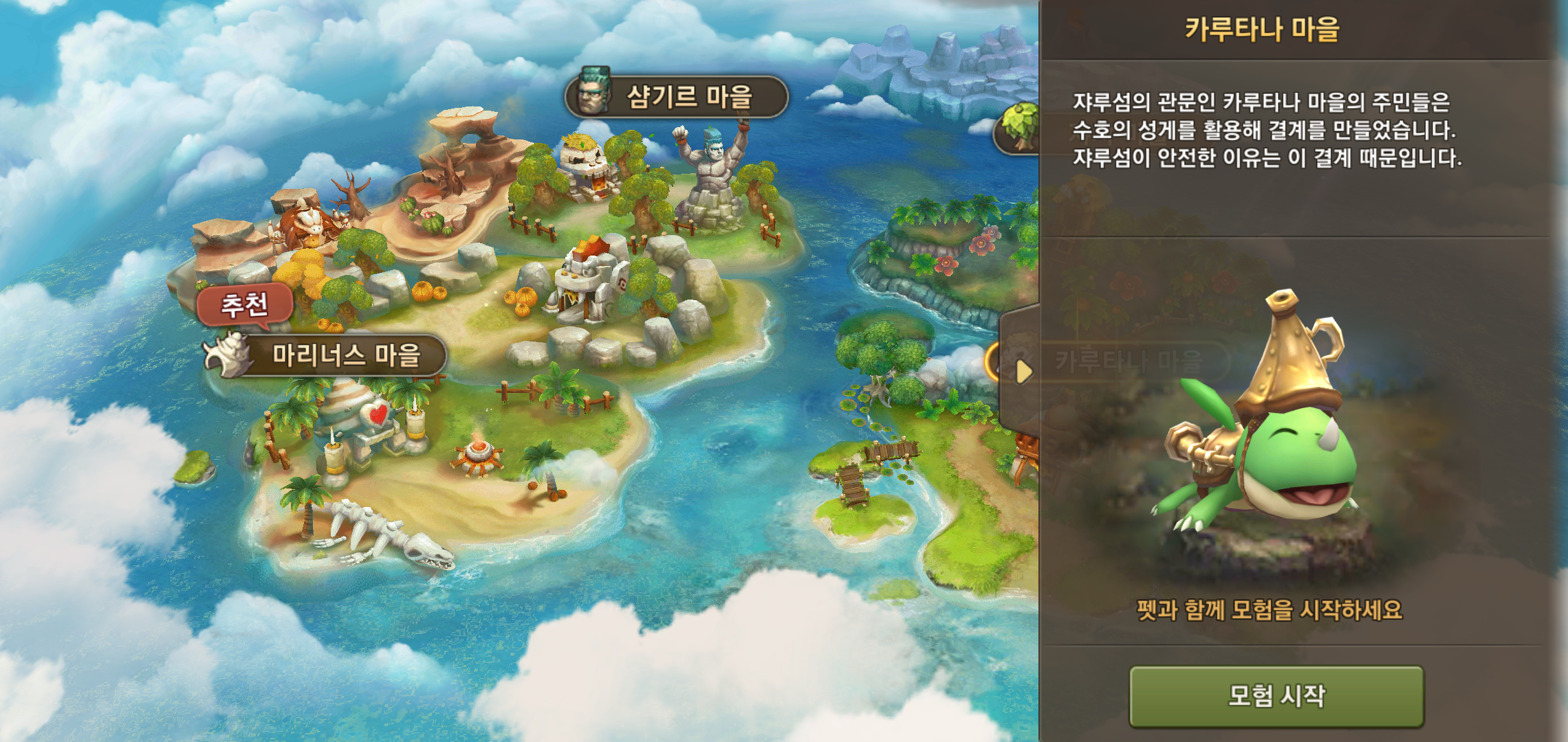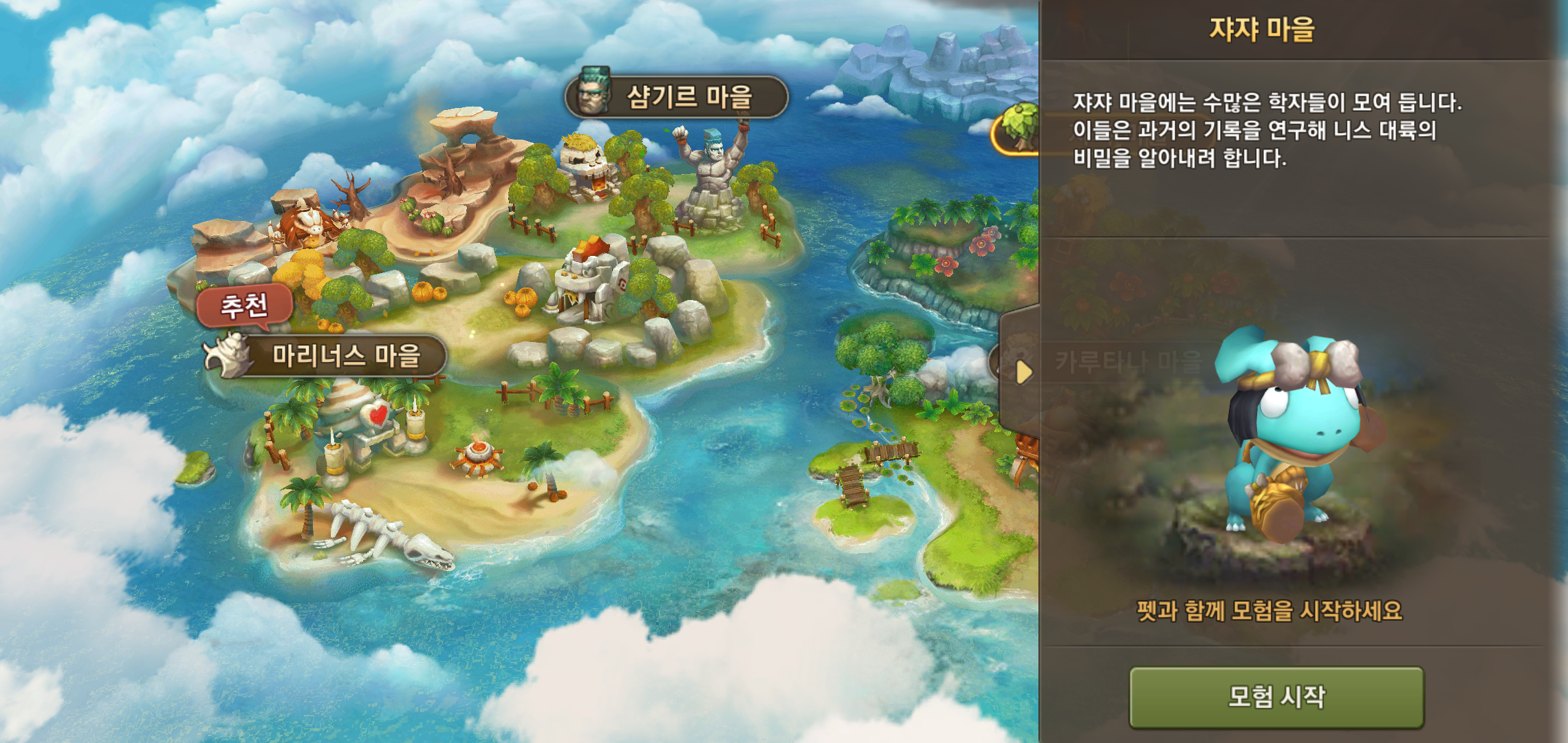 캐릭터 선택이 끝남과 동시에 펫과 함께 모험을 시작할 마을을 선택해야 했습니다. 마을 선택에 따라 함께 시작할 펫이 결정되기 때문에 마을이 아닌 펫 선택에 따라 선택해도 무방할 듯 보였습니다. 만약 이런저런 고민을 하고 싶지 않다면 추천하는 마을로 꾹 눌러주면 수월합니다.
