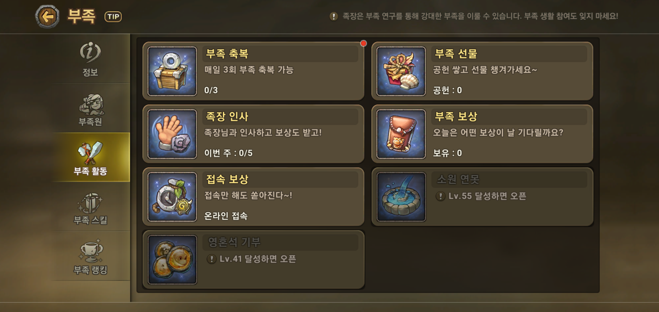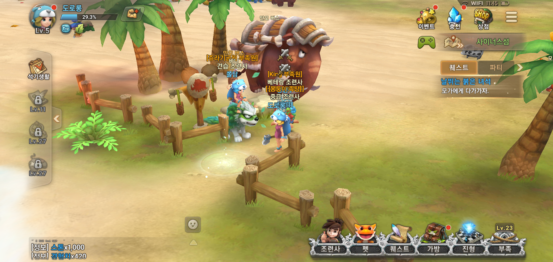 23레벨이 되면 부족에 가입해 다른 유저들과 함께 스톤에이지월드를 즐길 수 있습니다. 혼자서 즐기는 것도 좋지만 부족 가입시 받을 수 있는 혜택이 상당하기 때문에 마음에 드는 부족이 있다면 지체없이 가입하는 것을 추천드립니다. 다만 부족가입 조건이 있는 곳들도 상당하니 꾸준한 레벨업은 필수이고 말이죠.