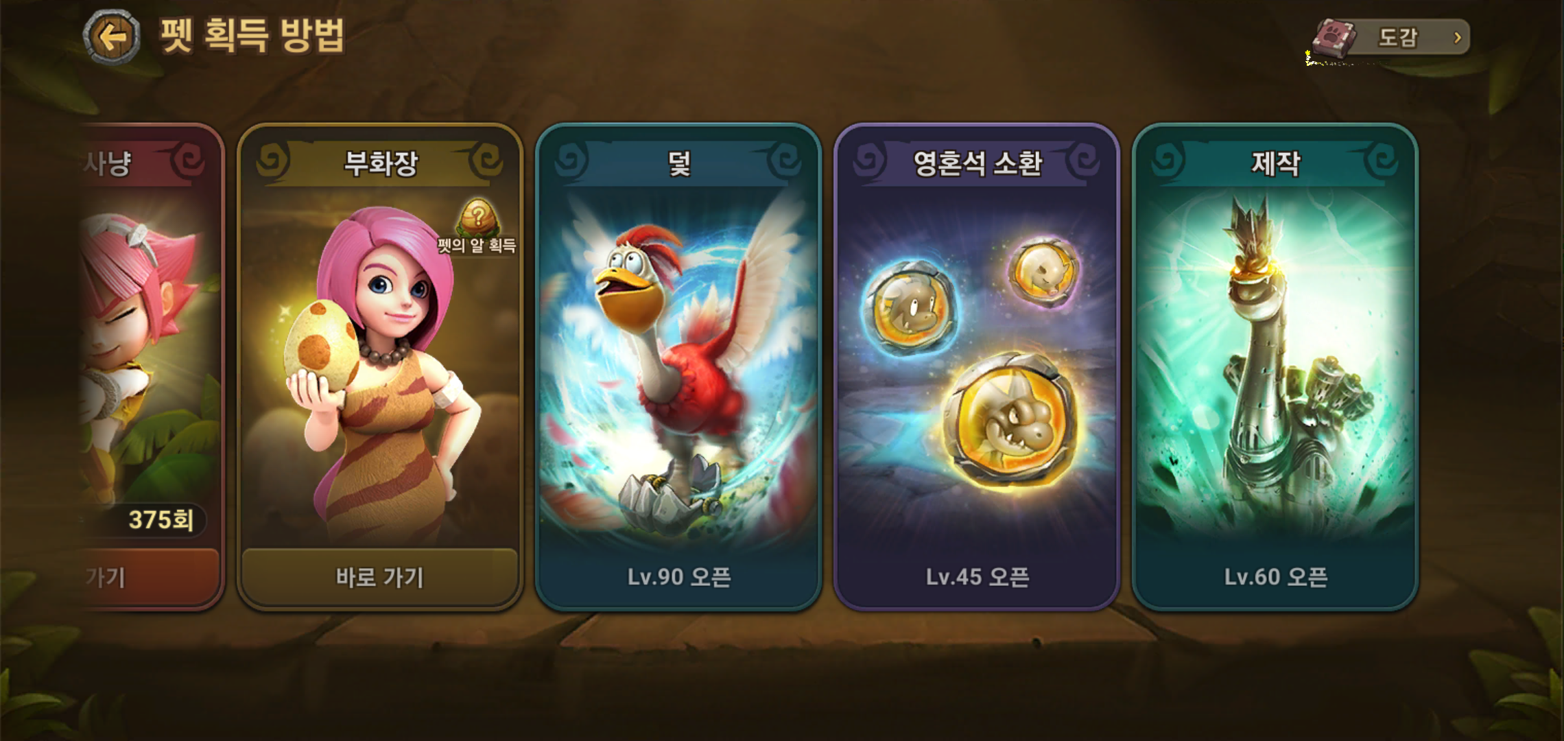 펫을 획득하는 방법은 포획부터 시작해 자동사냥, 부화장, 덫, 영혼석 소환 그리고 제작 6가지 방법으로 진행 가능합니다. 아무래도 초반에는 퀘스트를 진행하면서 획득하거나 포획이 가장 좋은 방법 중 하나인데요, 포획의 경우 필드에 보이는 펫을 바로 획득할 수 있는 장점을 가지고 있습니다.