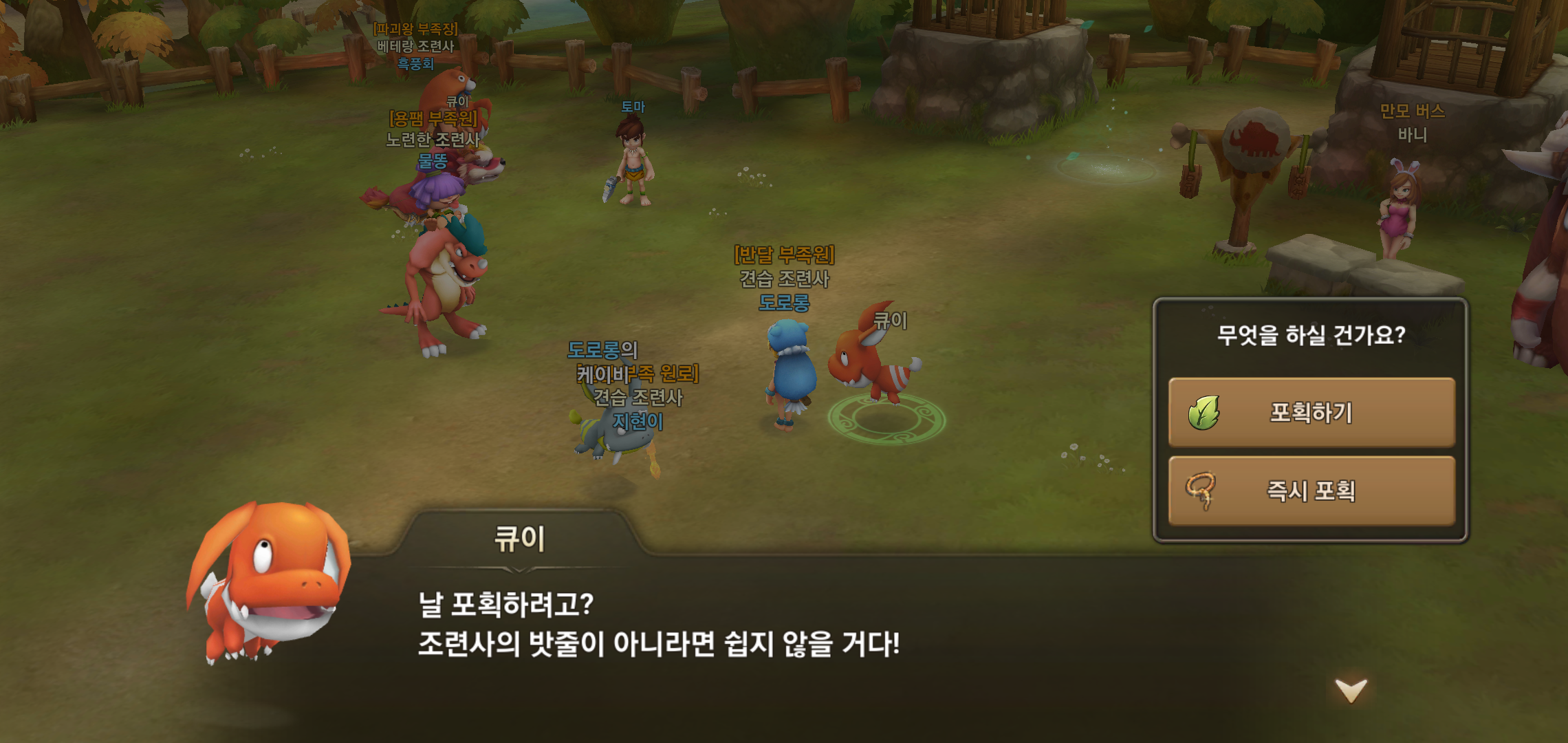 포획의 장점은 펫을 획득할 수 있다는 점입니다. 전투를 통해 진행하는 포획하기 방법과 즉시포획 두가지 방법으로 진행이 가능한데요, 포획전까지는 어떤 등급을 가지고 있는지 확인이 어렵다는 점입니다. 그래서 더욱 도전하고 싶은 방법이기도 하고 말이죠.