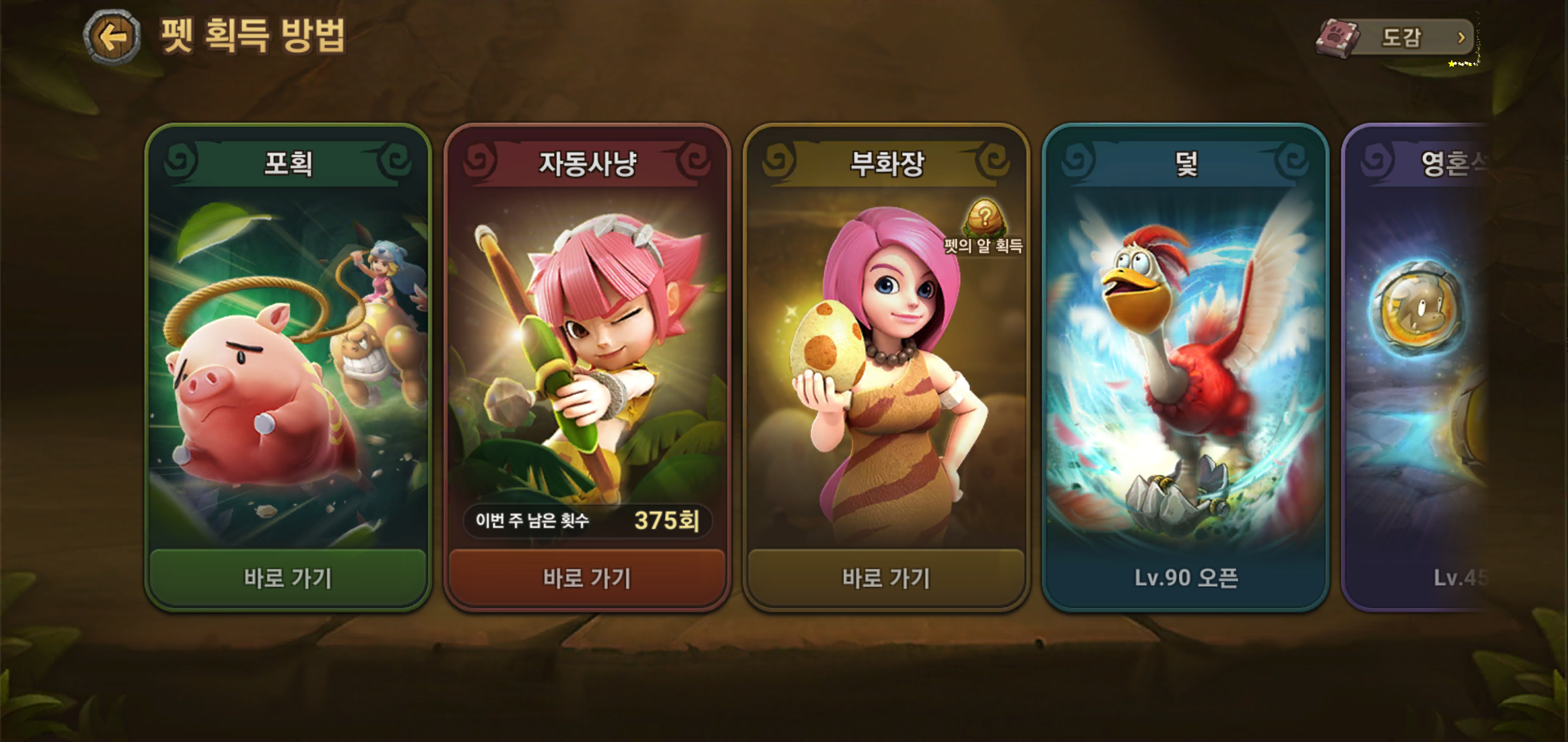 스톤에이지월드에서 캐릭터만큼 중요한 펫은 여러가지 방법으로 포획하여 획득 가능합니다. 초반에는 퀘스트만 따라가도 각기 다른 속성을 가진 펫 획득이 가능해 캐릭터 성장에 맞게 성장률을 높여주거나 스킬이나 연구를 활용해 능력치를 올려줄 수 있기도 합니다.