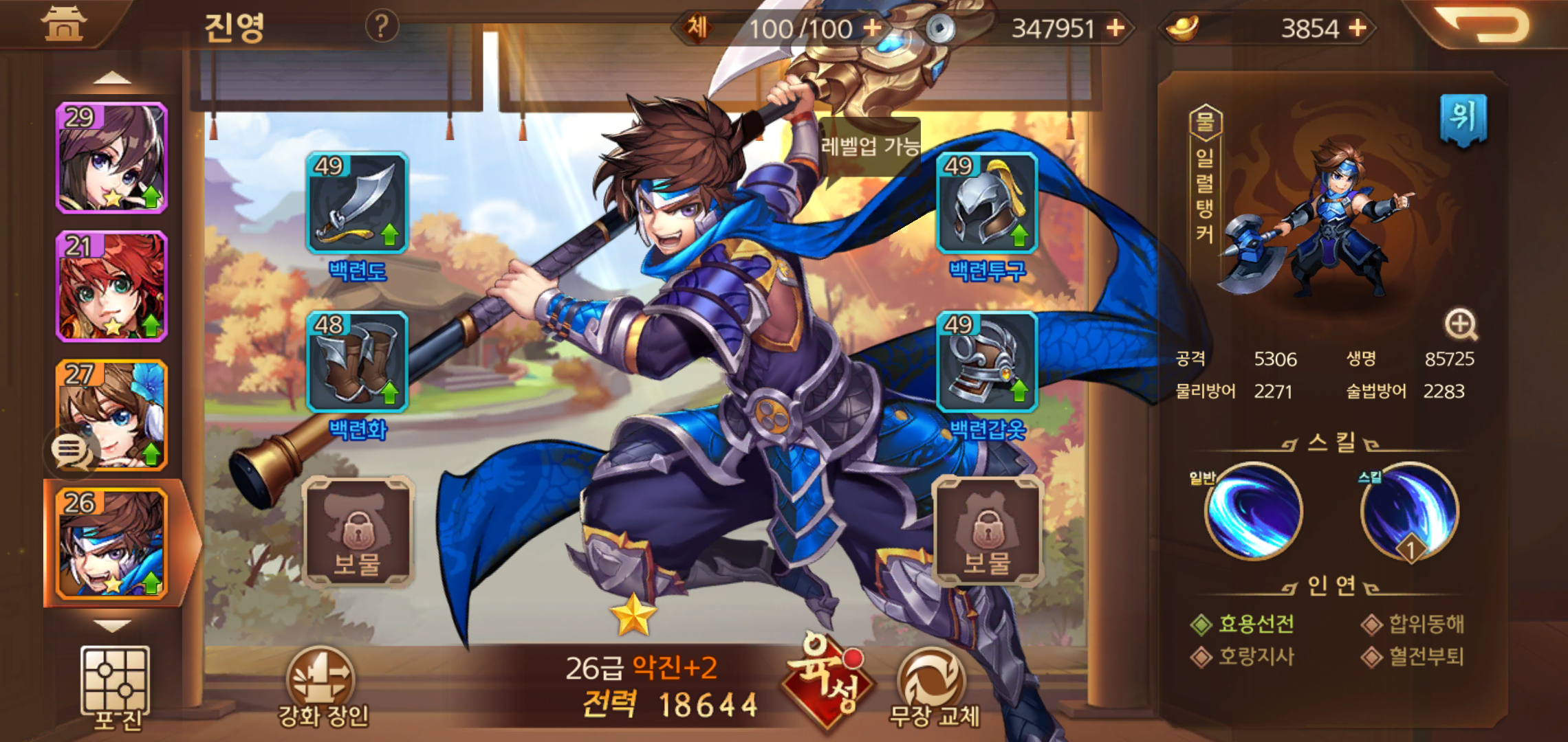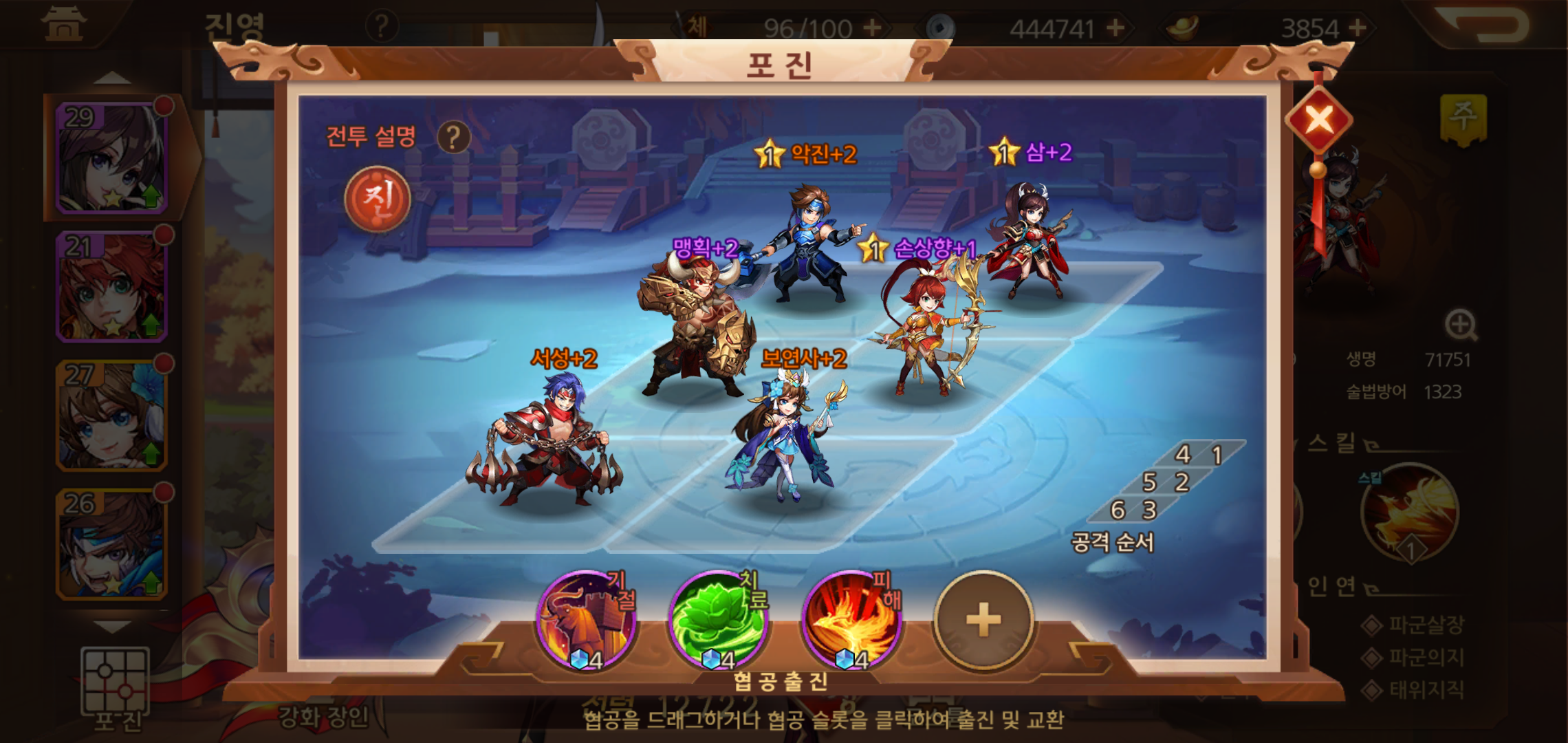 현재 보유하고 있는 무장들을 활용한 진영은 캐릭터를 포함해 빠르게 육성할 수 있는 무장들로 배치를 해두었습니다. 전투에 나서다 보면 각각의 무장이 가지고 있는 전투력도 중요하지만, 협공스킬에 따른 순간적인 폭발력을 무시할수 없기 때문에 무장이 많아 질 수록 덱구성에 대한 고민은 더욱 깊어지는 것 같습니다.