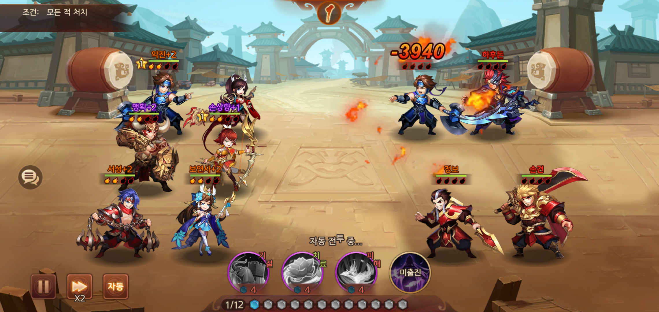 전투는 미리 설정한 진영에 따른 무장들과 적들과 승패를 가리는 방식으로 진행됩니다. 특히 협공스킬을 미리 설정해 두면 적재적소에 따라 사용할 수 있기 때문에 덱 구성시 협공스킬 배치라던가 협공가능한 무장들을 수집한 구성이 필수적입니다.