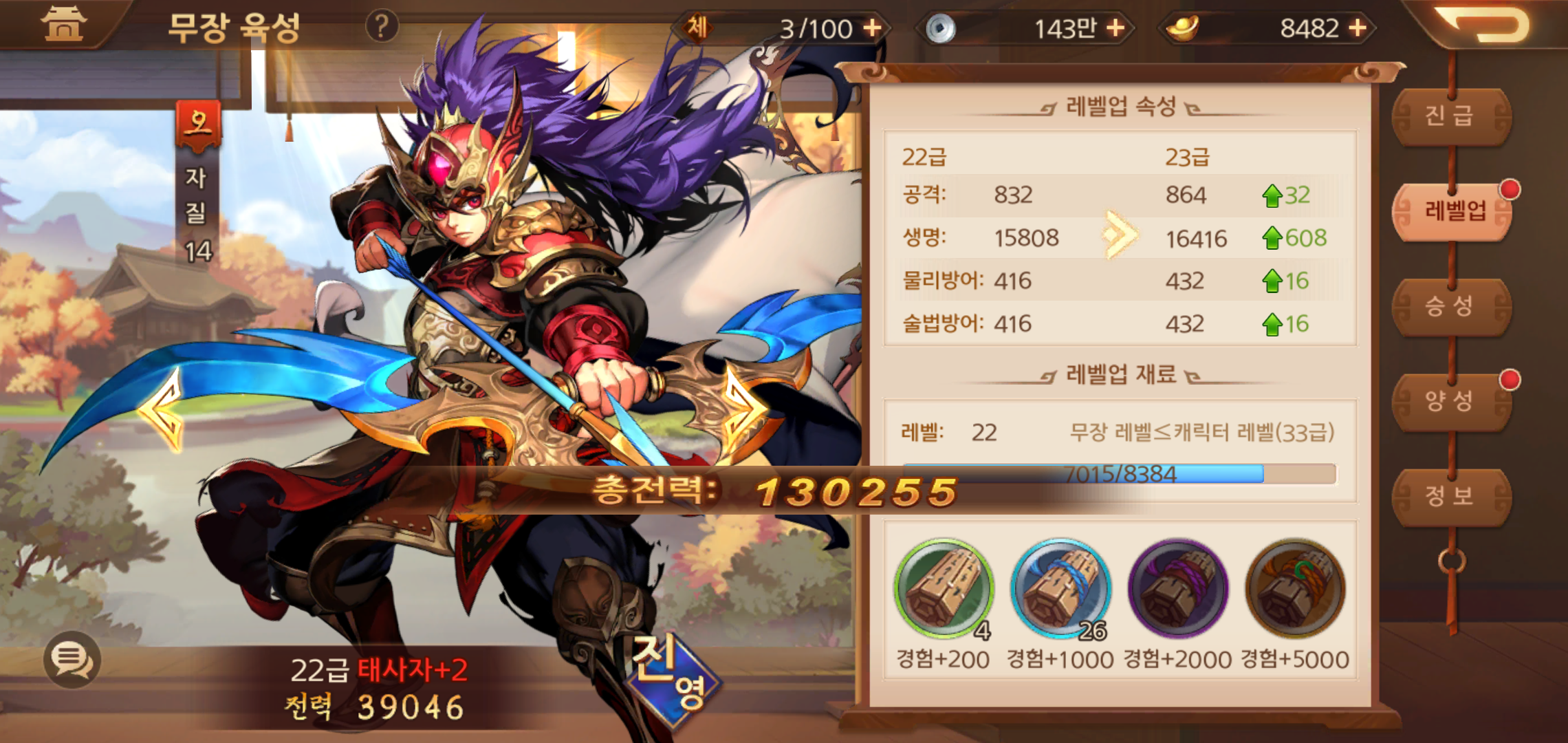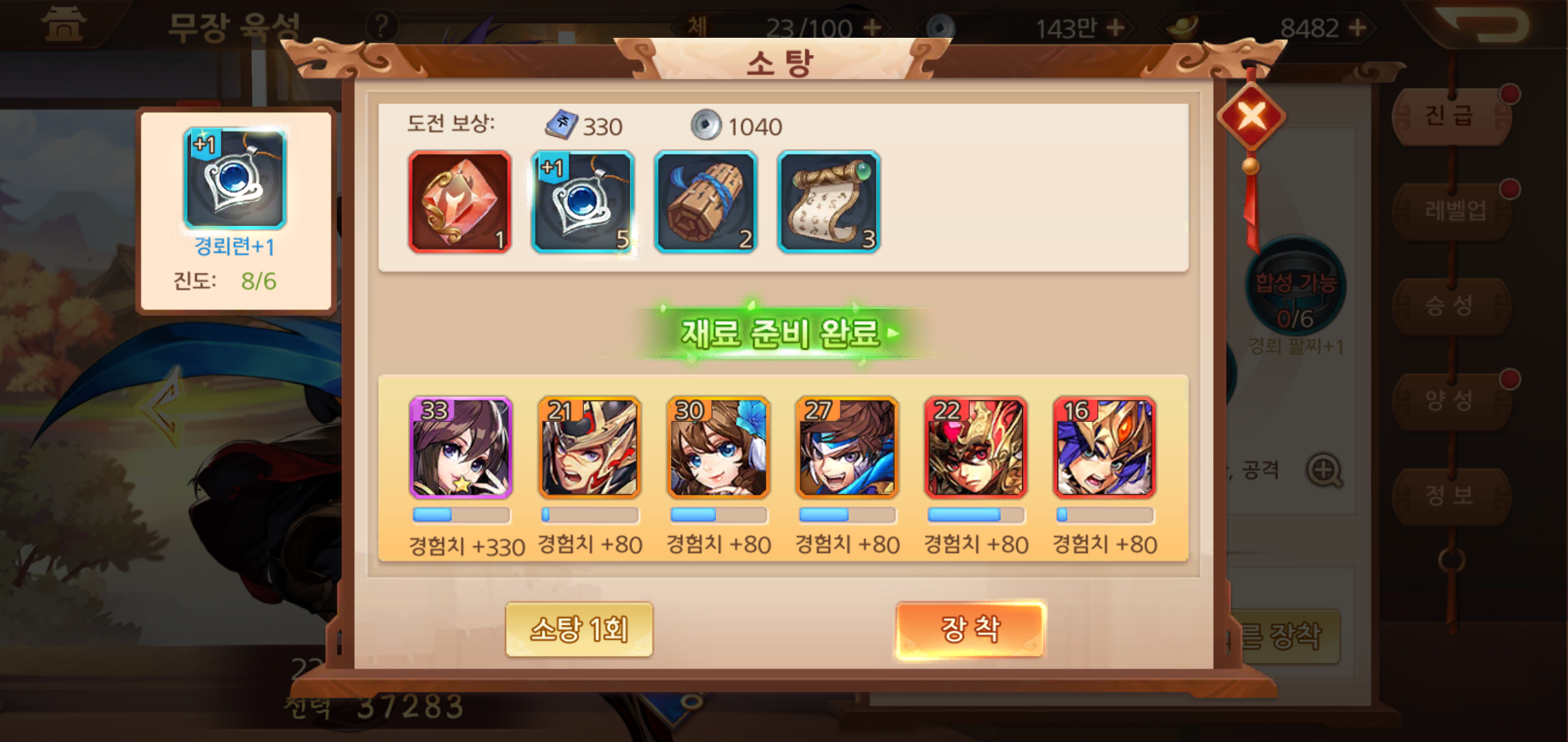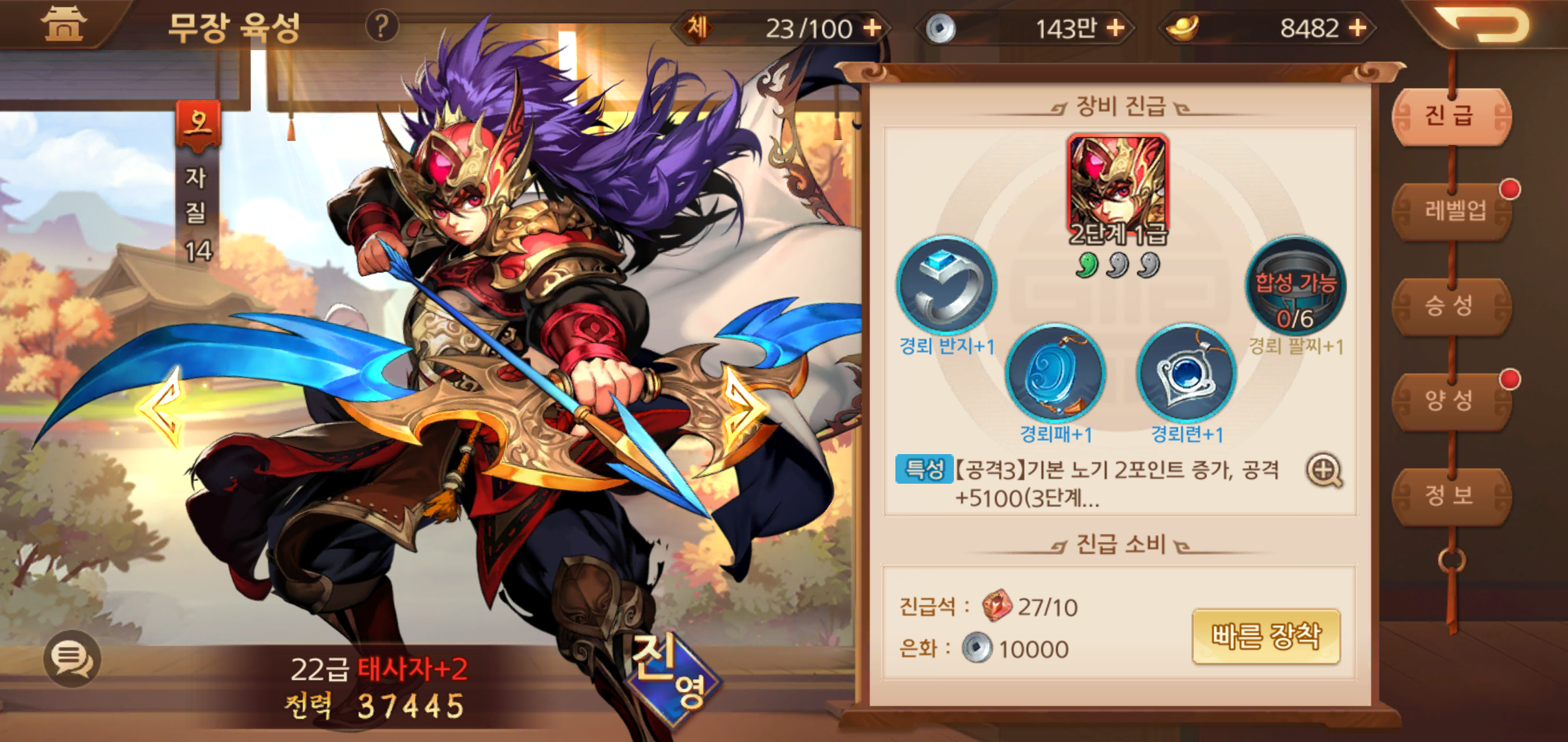 무장이 착용하는 장비도 챙겨주어야 합니다. 무장 레벨이 올라갈 수록 강화할 수 있는 레벨도 올라가는데요, 장비 레벨이 올라갈 수록 그에 따른 능력치도 올라가기 때문에 무장이 레벨업을 하면 진급 아이템과 장비강화까지 두루 살펴주어야 합니다.