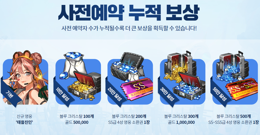 8월 27일까지 진행되는 사전예약에 참여하면 태을진인 신규영웅은 기본으로 사전예약 누적인원에 따른 추가보상도 주어집니다. 10만, 20만, 30만 그리고 50만명을 넘어설 때 마다 받을 수 있는 보상이 늘어나는데요, 50만을 달성하면 블루크리스탈부터 골드, SS급 4성 영웅 소환권에 SS~SSS급 4성 영웅 소환권도 추가로 받을 수 있어 함께 즐기고 싶은 친구가 있다면 서둘러 챙겨야 할 것 같습니다.