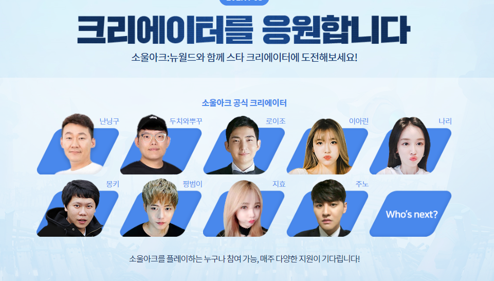 크리에이터를 응원하는 이벤트도 진행 중입니다. 주 1회 1시간 이상의 소울아크 게임 콘텐츠를 생방송으로 방송 콘텐츠 제작이 가능한 분들이 있다면 신청을 통해 월 최대 4,000 레드 크리스탈을 지급한다고 하는데요, 크리에이터를 꿈꾸는 분들이라면 이번 기회를 놓치지 말고 도전해 보는 것도 좋을 것 같습니다.