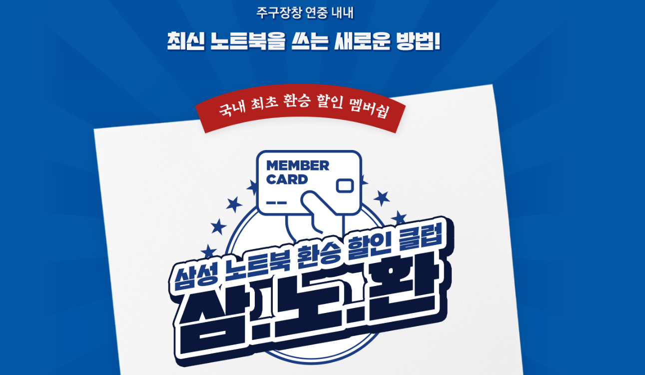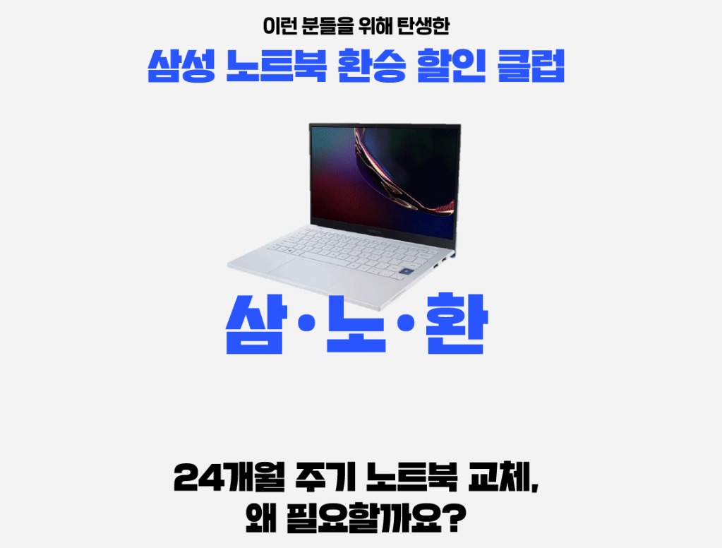 삼노환은 삼성 노트북 환승 할인 클럽 서비스의 줄임말로, 신상 노트북을 2년동안 사용하고, 최대 50%에 달하는 보상 판매금액을 지원받아 최신 노트북으로 교체가능한 프로그램으로, 지금까지 둘도 없는 특별한 서비스라고 할 수 있습니다.