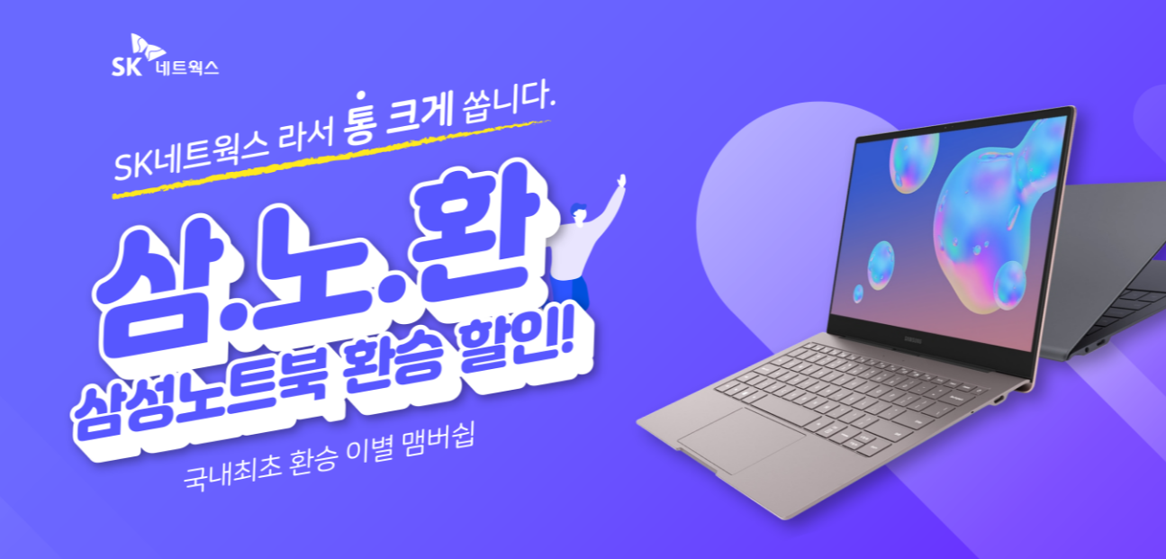 SK 네트웍스 SK 네트웍스라서 통 크게 쏩니다. 삼.노.환 삼성 노트북 환승 할인! 국내 최초 환승 이별 멤버쉽 SK네트웍스가 삼성 노트북을 가장 저렴하게 사용하는 환승 경로를 알려드립니다. 삼노