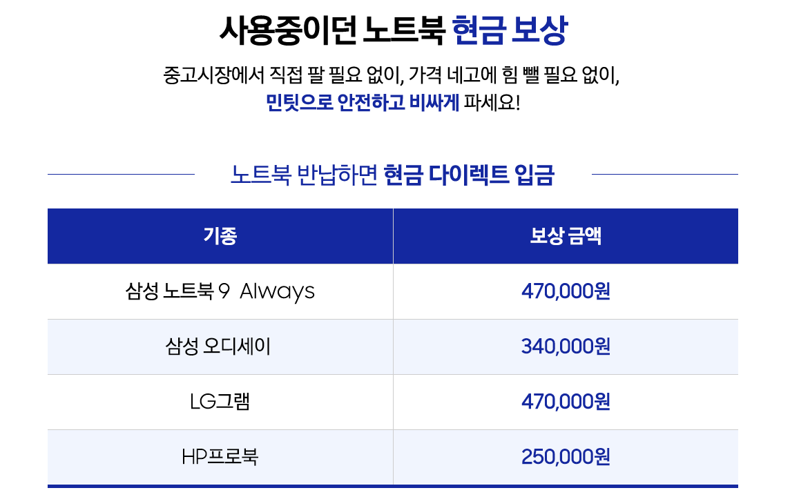 현재 사용중인 노트북의 경우에도 삼노환 클럽에 가입하고 민팃으로 현금 보상을 받은 후 원하는 노트북 구매도 가능합니다. 기종에 따라 노트북 상태에 따라 가격의 차이가 있을 수 있지만, 중고시작에서 직접 판매하면서 생기는 스트레스라던가 개인정보 유출에 대한 걱정없이 정리도 가능합니다. 이외에도 보유하고 있는 노트북 중고가가 어느정도인지 확인도 가능합니다.