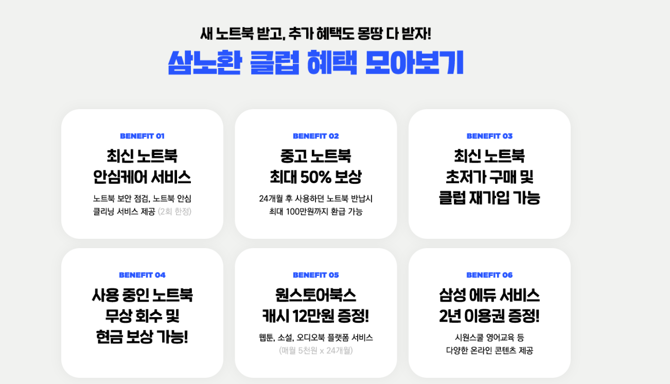 삼노환 클럽 혜택은 최신 노트북을 최저가로 구매 가능한 점 외에도 여러 혜택들로 구성되어 있습니다. 최신 노트북 안심케어 서비스는 기본 24개월후 사용하던 노트북 반납시 최대 100만원까지 환급 가능한 중고 노트북 50% 보상도 주어진 혜택중 하나입니다. 여기에 원스토어북스 캐시 12만원 증정과 삼성에듀 서비스 2년 이용권등 다양한 혜택들로 구성되어 버릴게 하나도 없을 정도입니다.