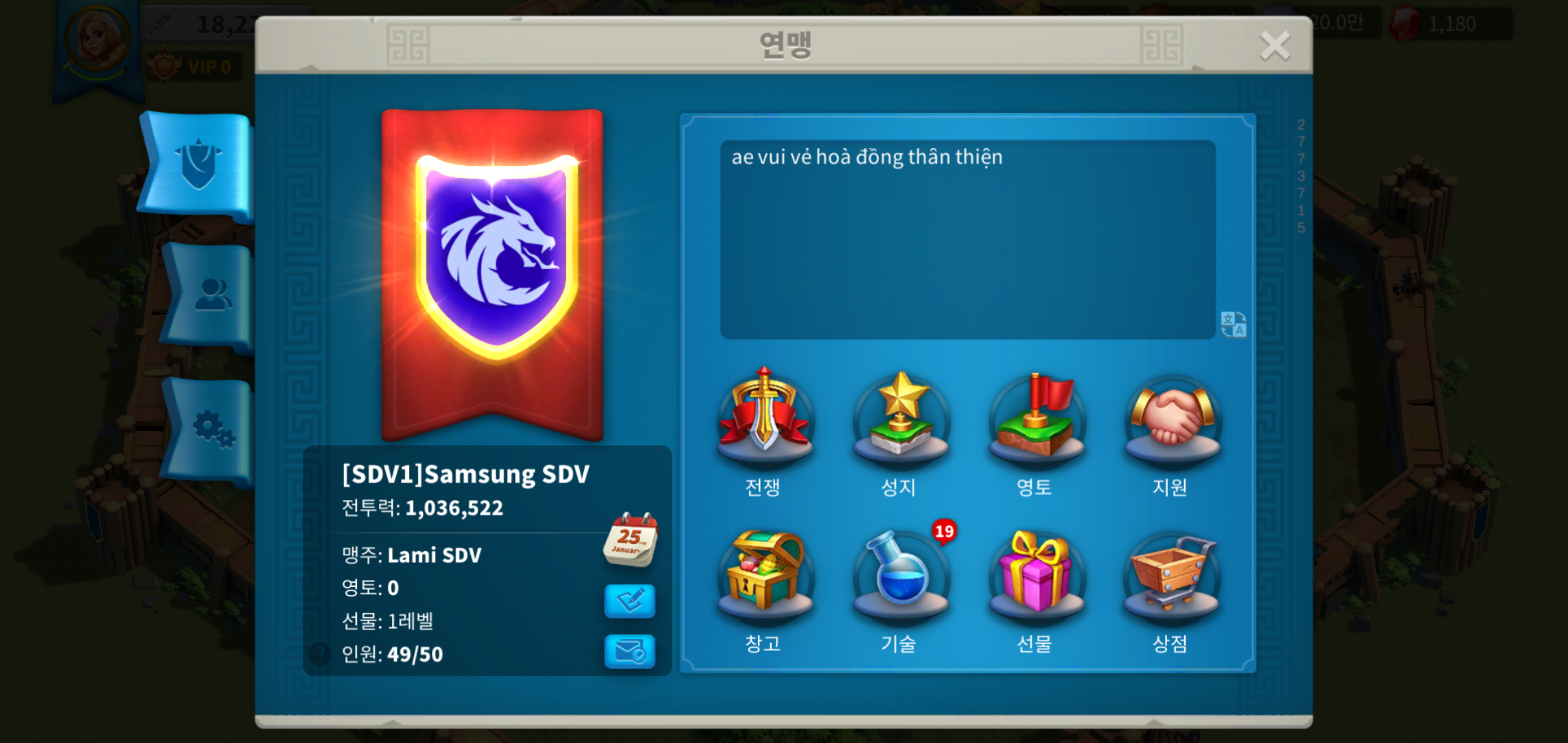 그리고 라이즈오브킹덤즈를 시작하는 분들이라면 연맹가입은 필수적으로 하시라고 이야기 하고 싶습니다. 혼자서 즐기는 재미도 있지만, 연맹원을 통해 도움을 주고 받는 부분이라던가, 선물등 주어지는 혜택이 많은데요, 국내에서 생성된 연맹이라면 더할나위 없지만, 초반 성장을 위해 버프가 필요한 상황이라면 어떤 연맹이든 가입을 통해 충분한 도움을 받을 수 있습니다.