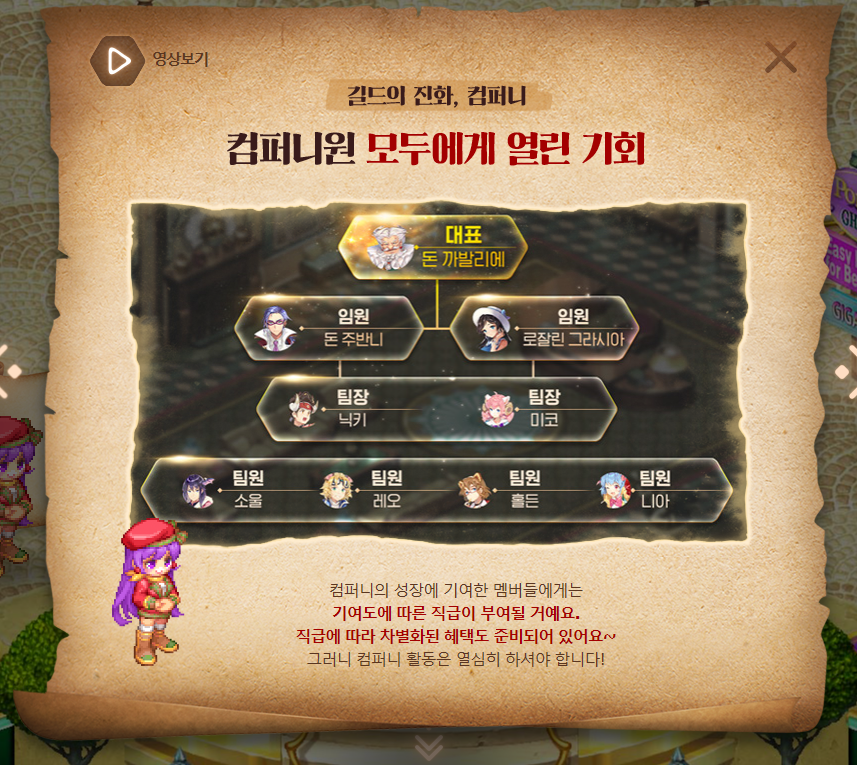 신작모바일게임 트릭스터M 내에서 길드 시스템은 기존 길드에서 진화된 컴퍼니란 이름을 갖고 동료들과 함께 활동하게 됩니다. 컴퍼니라는 이름 처럼 기존 길드와는 달라진 모습들도 눈에 띄는데요, 컴퍼니 성장에 기여하면 할 수록 그에 따른 직급이 상승하는 방식입니다.