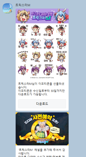 신작모바일게임 트릭스타M과 관련된 발빠른 소식은 카카오톡 채널을 통해 학인할 수 있습니다. 특히 카카오톡 채널을 추가하면 특별한 이모티콘을 받을 수 있으니 소식도 받고, 선물도 받는 일석이조의 혜택이 아닐까 합니다. 단 이모티콘은 선착순으로 진행되어 10만개만 제공된다고 하니 서둘러야 합니다.