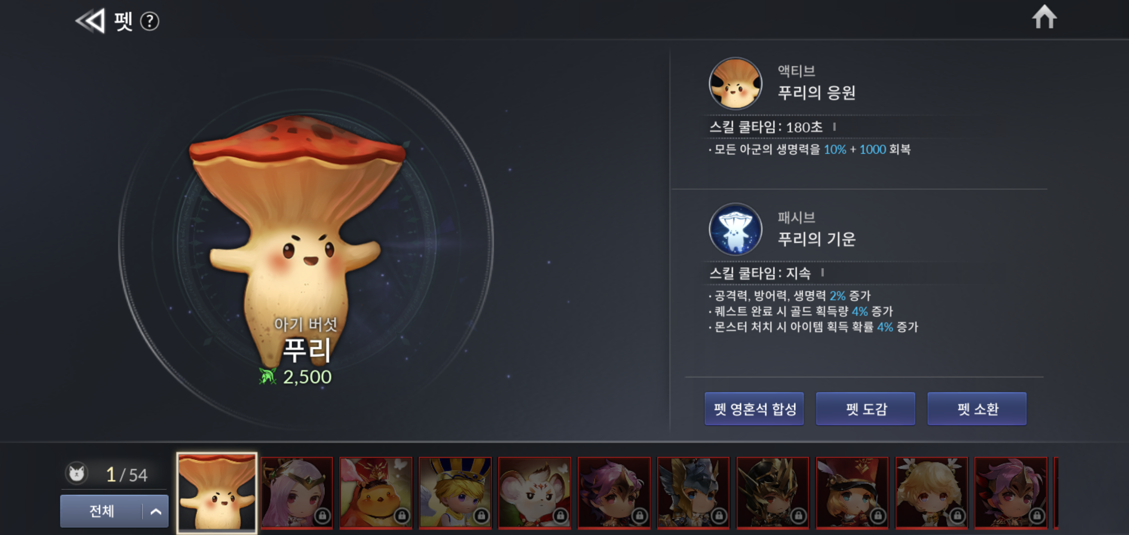 팀의 전투력을 상승시키고, 펫 스킬로 전투에 도움을 받을 수 있기 때문에 진형에 펫을 설정하는 것도 중요합니다. 초반 푸리가 가진 스킬은 영웅 생명력을 회복시켜주기 때문에 위급한 상황에서 상당한 도움을 받을 수 있습니다. 여기에 패시브 스킬로 공격력과 방어까지 올려주니 꼭 챙겨야 하구요.