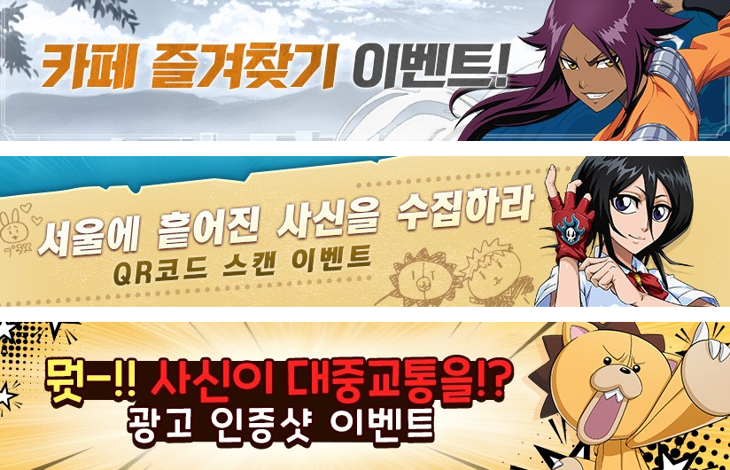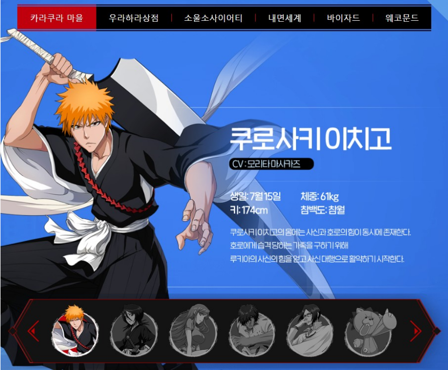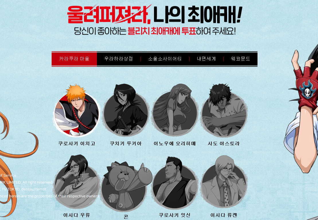 사전예약 진행과 함께 다양한 이벤트도 열리고 있습니다. 먼저 좋아하는 블리치 최애캐에 투표하는 이벤트로, 쿠로사키 이치고를 비롯해 블리치에 등장하는 캐릭터중 최애캐를 선택하면 되는 간단한 이벤트입니다.