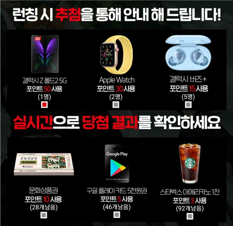 친구초대이벤트라던가 최애캐 투표 이벤트등 현재 진행중인 이벤트에 참여하고 획득한 포인트는 원하는 경품에 응모해 당첨의 기회를 잡을 수 있습니다. 응모 가능한 선물들의 경우 갤럭시Z폴드 5G부터 애플워치, 갤럭시버즈, 문화상품권, 구글플레이카드, 스타벅스 아메리카노에 이르기까지 다양한 만큼 열심히 포인트를 모아 선물에 응모해 득템의 기회를 잡아보시는건 어떨까요?