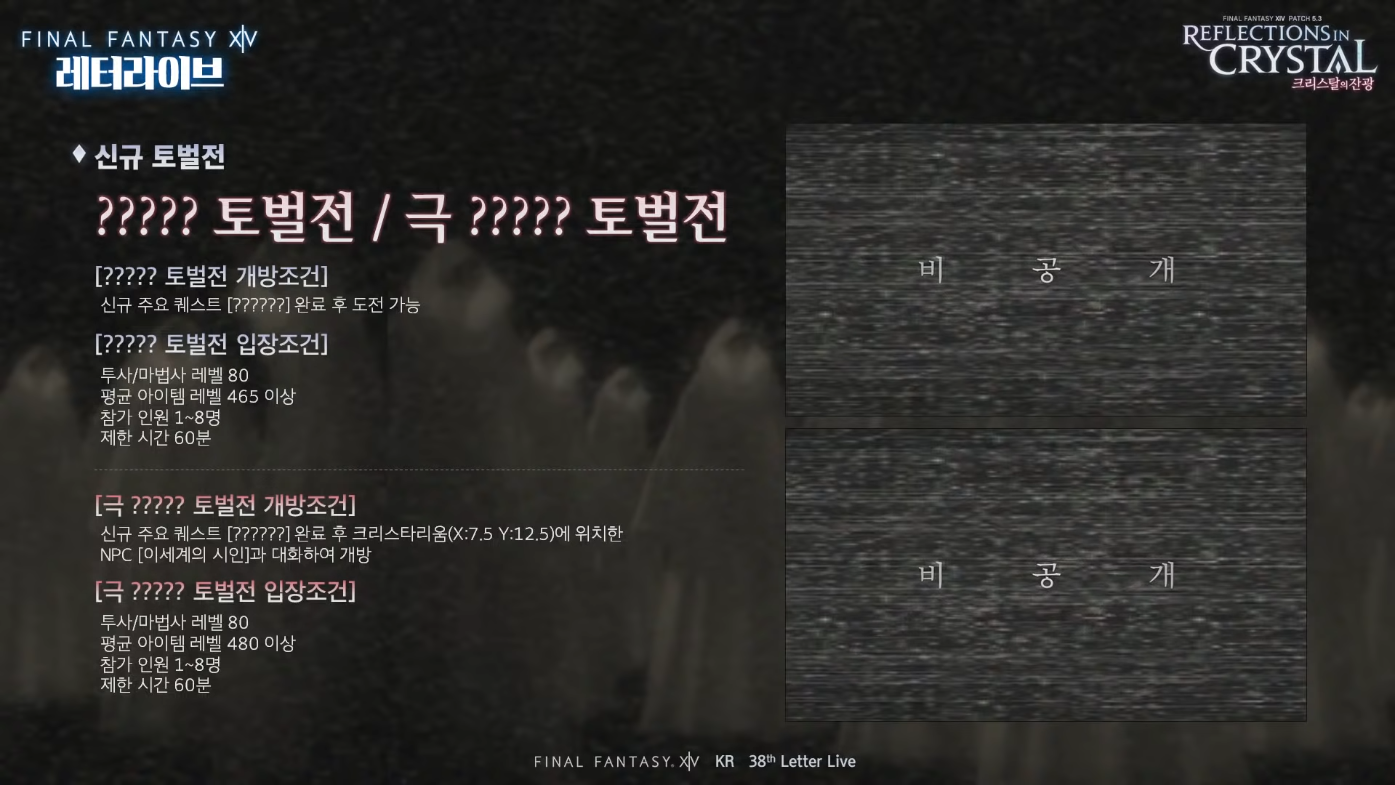 5.3 업데이트에서는 칠흑의 반역자 확장팩 마지막 스토리가 업데이트 되는 만큼 신규 인스턴스 던전도 생성되었습니다. 80레벨 4인던전 노르브란트를 포함해 신규 토벌전과 극 토벌전이 준비되어 있습니다. 특히 신규로 등장하는 극토벌전의 경우 입장조건을 제외한 모든 내용은 공개되지 않아 어떤 중요한 스토리를 담고 있는지 많은 유저들의 궁금증을 자아낼 정도입니다.