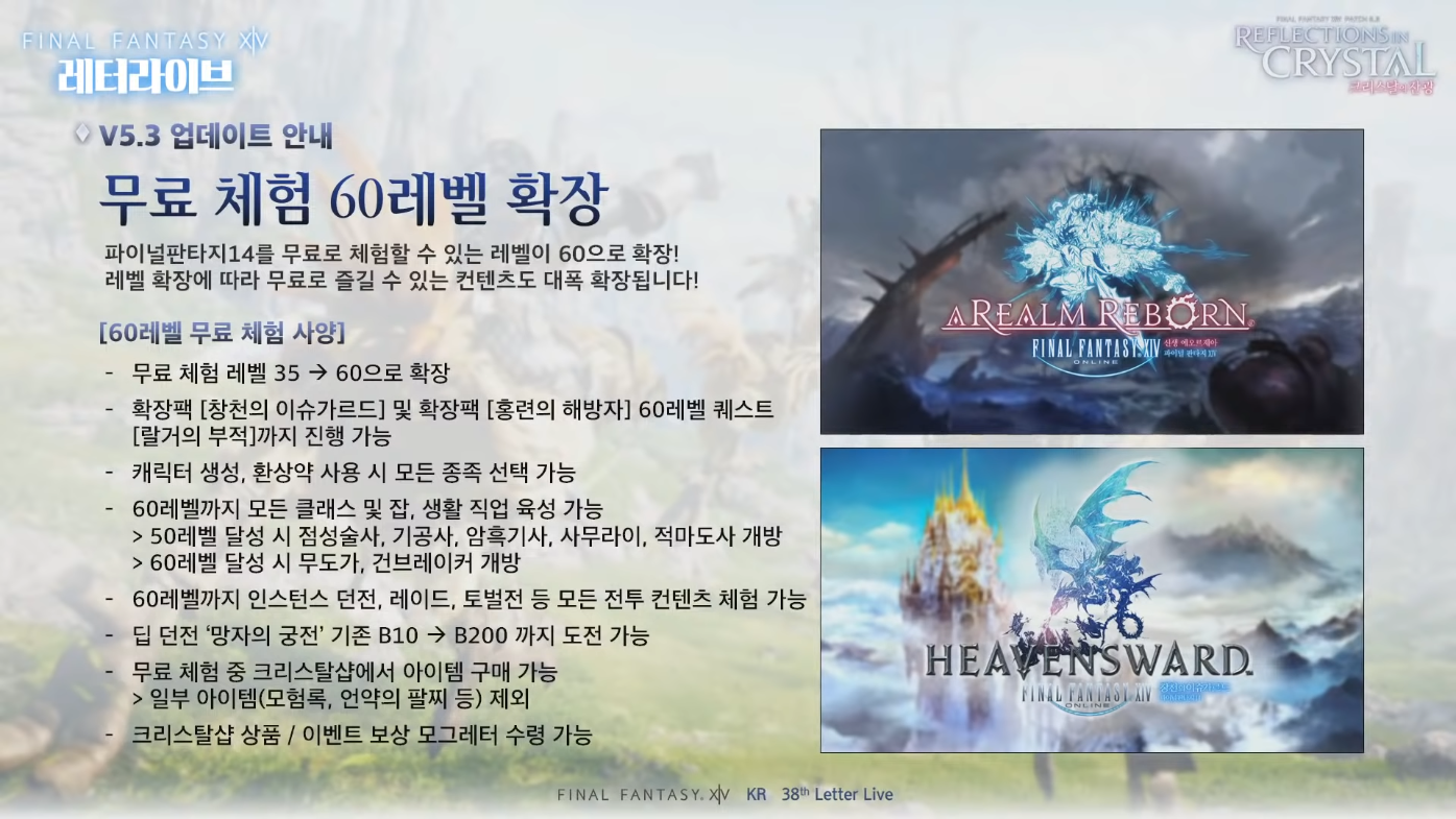 무료체험 구간도 확장되었습니다. 이전에는 35레벨까지만 무료체험이 가능했는데요, 60레벨까지 늘어나 보다 흥미진진한 PCMMORPG 파이널판타지14를 즐길 수 있게 되었습니다. 뿐만 아니라 확장팩 창천의 이슈라그르와 홍련의 해방자 그리고 60레벨 퀘스트 랄거의 부족 진행도 가능한데요, 60레벨까지 클래스 및 잡, 생활 직업 육성까지 가능합니다.