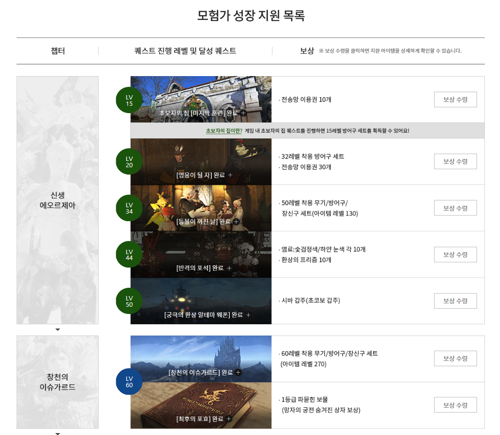 시작하는 유저나, 복귀 유저들의 성장을 도와줄 모험가 성장지원도 개편되었습니다. 70레벨까지 레벨에 따라 도움이 되는 다양한 아이템이 지급되는데요, 32레벨을 넘어서면 레벨 착용 무기와 방어구 그리고 장신구세트까지 레벨에 따라 주어지기 때문에 장비에 대한 스트레스 없이 달릴 수 있어 부담 없이 파이널판티지14를 즐길 수 있습니다.