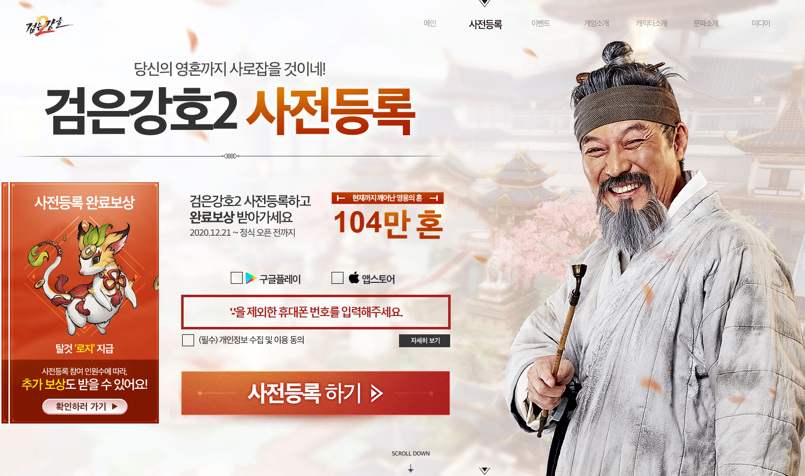 영혼까지 채워줄 단 하나의 신작으로 눈길을 사로잡고 있는 모바일MMORPG 검은강호2 사전등록이 현재 진행 중입니다. 사전등록은 본인의 OS를 선택하고 휴대폰번호를 입력하는 방식으로 간단히 참여 가능합니다. 또한 사전등록에 참여한 모든 인원에게는 탈것 로지를 지급해 시작과 함께 탈것을 획득한 플레이를 즐길 수 있습니다.