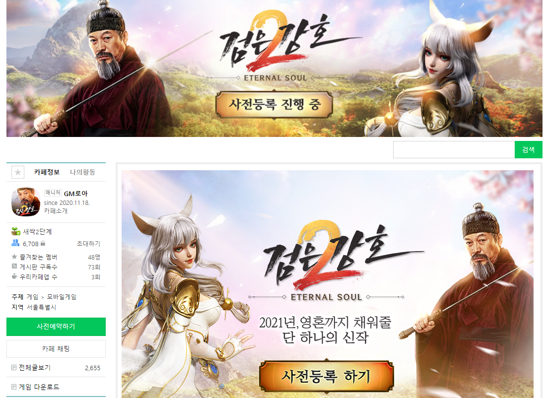 검은강호2와 관련된 발빠른 소식들은 공식카페를 통해 확인 가능합니다. 현재 사전등록 이벤트외에 공식카페에서 다양한 이벤트가 진행 중인데요, 간단한게 참여하고, 풍성한 선물의 주인공이 될 수 있는 만큼 서둘러 참여해 풍성한 혜택을 모두 받아보시기 바랍니다!