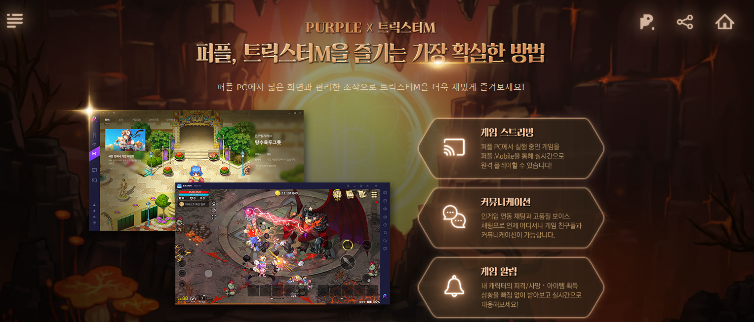 신작 MMORPG 트릭스터M은 스마트폰은 기본, 퍼플을 이용해 PC에서도 손쉽게 즐길 수 있도록 구성되어 있습니다. 넓은 화면과 편리한 조작으로 트릭스터M을 더욱 즐겁게 즐길 수 있는 퍼플은 모바일을 통해 실시간 원격플레이도 가능하고, 인게임과 연동해 커뮤니케이션 및 게임 알림도 가능한데요, 언제 어디서든 원하는 플레이를 입맛에 맞게 즐길 수 있어 더욱 재미있는 모험을 즐길 수 있어 기대감이 더욱 커지는 중입니다.