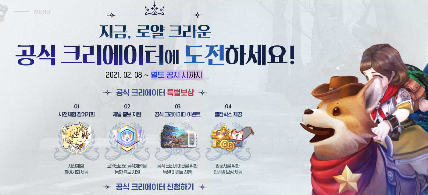 사전예약 진행과는 별도로 로얄크라운 공식 크리에이터에 도전할 수 있는 이벤트가 진행 중입니다. 공식 크리에이터가 되면 사전체험 참여기 회부터 로얄크라운 공식채널을 통한 홍보 지원, 공식크리에이터를 위한 특별 이벤트 그리고 입문자를 위한 웰컴박스 보상까지 받을 수 있는데요, 게임 크리에이터를 해보고 싶었던 분들이라면 로얄크라운과 함께 도전해 보는 것도 좋을 것 같습니다.