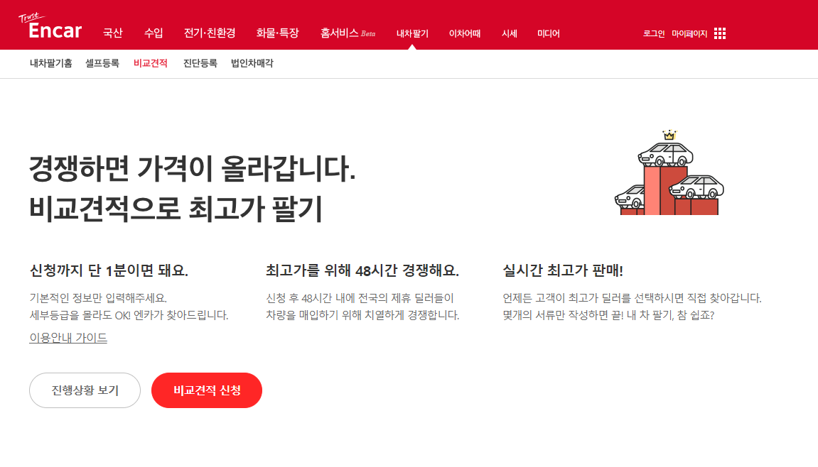 엔카에서 활용 가능한 다양한 방법들이 있지만, 현재 차량이 어느정도 가치를 가지고 있는지 비교견적을 받아보았는데요, 신청까지 그리 오래 걸리지 않고, 최고가를 위해 48시간 경쟁하는 방식이라 무척이나 마음에 들었습니다.