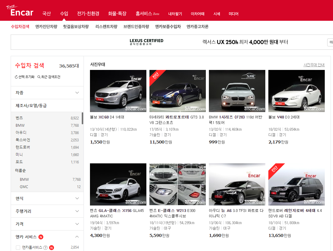 엔카에 접속하면 딜러들이 올려놓은 다양한 차량을 확인할 수 있었습니다. 중고차량의 경우 원하는 매물이 많지 않거나, 허위매물로 인해 우려되는 부분들이 있기 마련인데, 엔카 진단 차량을 이용하면 전문가분들이 직접 차량을 확인하고 매물을 올리고 있어 걱정 없이 이용할 수 있더군요. 더욱이 진단 결과 오류 시에는 진단비의 최대 20배까지도 보상받을 수 있으니 더욱 믿을 수 있었습니다.