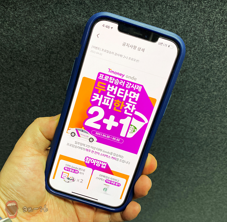 티머니onda 첫 이용 고객 프로모션으로 제공되는 GS25 모바일 편의점 상품권외에도 일주일에 두번 이상 티머니onda 를 탑승하는 프로 탑승러에게 매주 한잔씩 스타벅스 커피를 제공하는 프로모션도 진행 중입니다. 이름하여 프로탑승러 감사제 두번타면 커피한잔 2+1