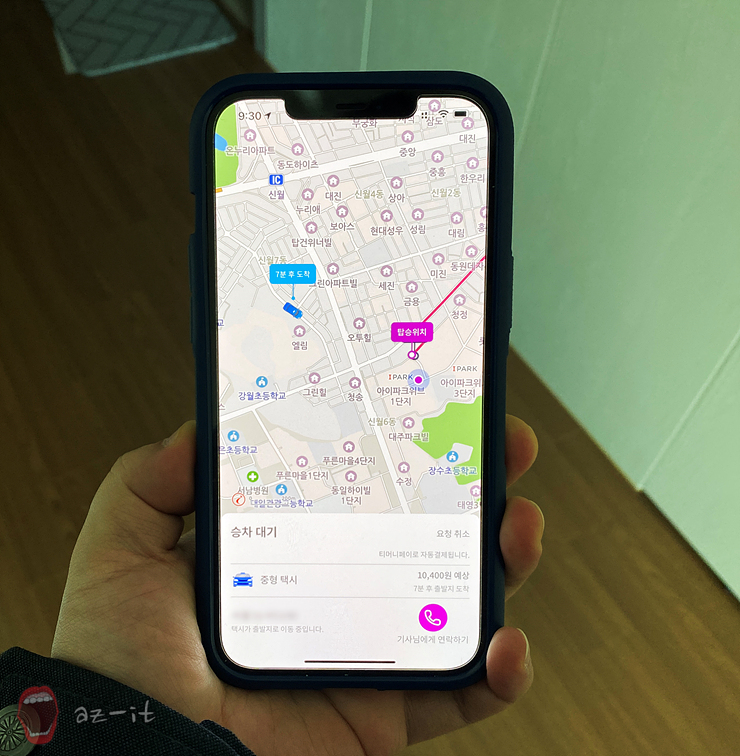 택시 종류 선택까지 마무리 되면 결제 수단 선택으로 배차가 진행 됩니다. 배차가 완료되면 탑승 위치를 기준으로 현재 차량 위치와 도착에 걸리는 시간까지 확인할 수 있고, 해당 기사분에게 연락도 가능해 시간에 쫓기듯 이동하지 않아도 되더군요.