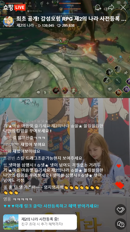 제2의나라 출시를 앞두고 다양한 이벤트와 행사도 진행되었습니다. 무엇보다 눈길을 끈 이벤트는 홍진호와 딘딘이 출연해 진행한 라이브 커머스 방송인데요, 초기 목표였던 22,222명을 훨씬 웃도는 14만 3천 명이 시청했을 정도이니 제2의나라에 대한 관심이 얼마나 뜨거운지 알 수 있었습니다. 벌써부터 대박 조짐이 보인다고 할까요?