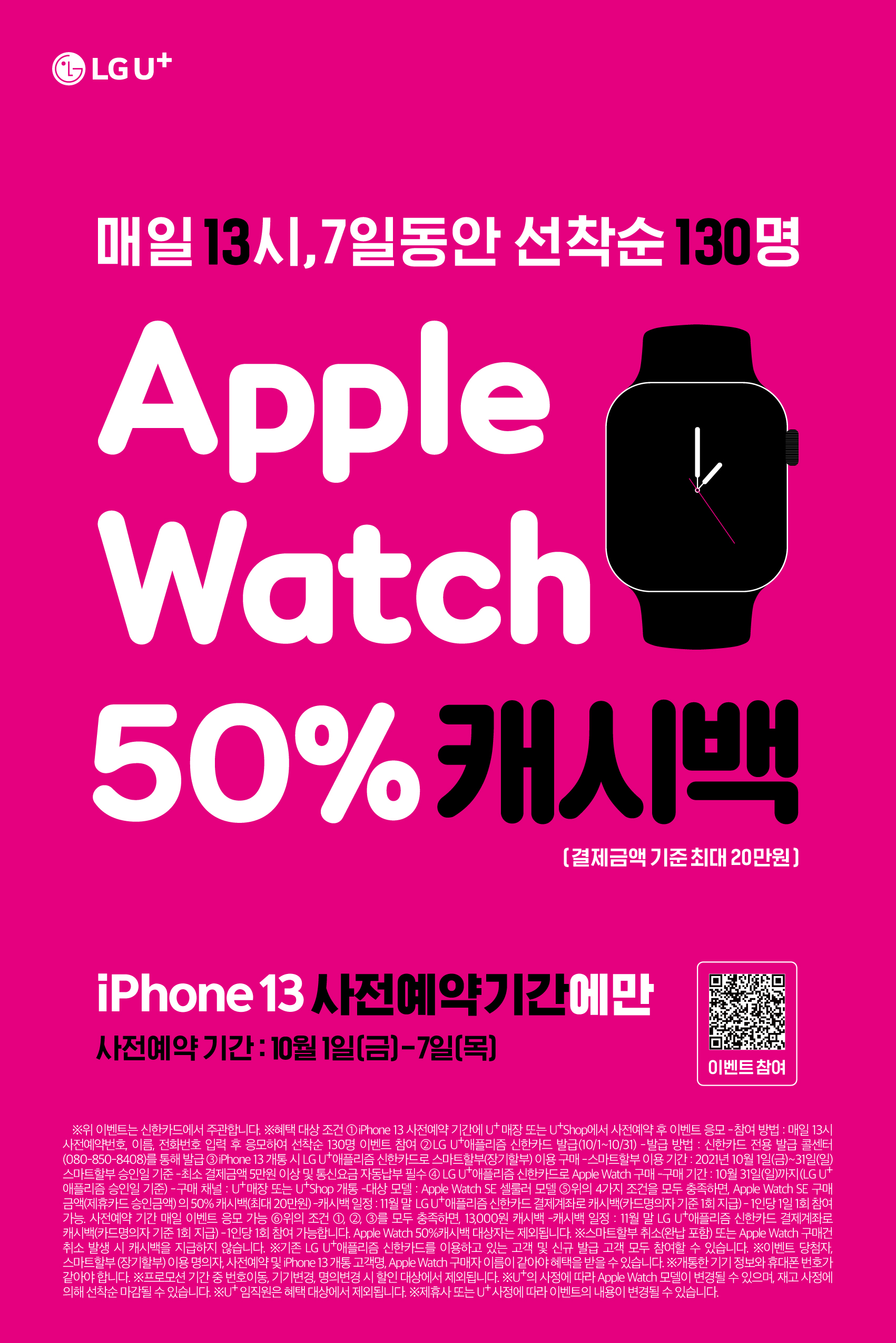 아이폰13 사전예약 기간인 10월 1일부터 7일까지 매일 13시 7일동안 선착순 140명에게 애플워치 50% 캐시백이 적용되는 이벤트도 진행되고 있습니다. 아무래도 아이폰13을 선택하는데 있어 LG유플러스만큼 다양한 요금제와 풍성한 선물이 주어지는 곳이 또 있을까 싶은만큼 LGU+ 에서 아이폰13을 선택하고 주어지는 모든 혜택을 챙겨보시기 바랍니다.