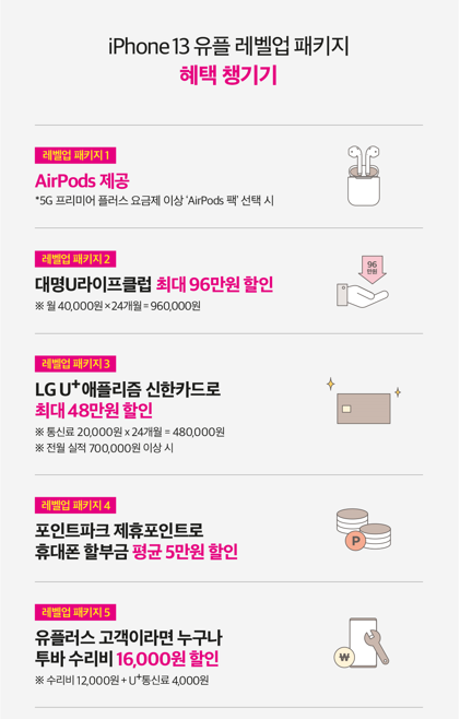 LG유플러스 유플레벨업 패키지 혜택은 에어팟을 무료, 대명U라이프 클럽 최대 96만원 할인, LG U+ 애플리즘 신한카드로 최대 48만원 할인, 포인트 파크 제휴로 휴대폰 할부금 평균 5만원 할인, 투바 수리비 16,000원 할인까지 다양하게 준비되어 있어 본인에게 맞는 요금제를 선택하고 그에 따른 혜택을 받아볼 수 있으니 참고하시면 좋을 것 같습니다.