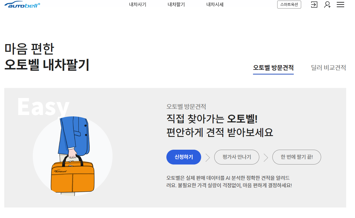 내차팔기에 있어 오토벨의 차별화된 서비스는 방문견적이라고 할 수 있습니다. 전문 차량 평가사가 있어 내차 평가부터 판매까지 도움을 받을 수 있는데요, 이름과 연락처 그리고 방문 지역만 남기면 해당 내역을 보고 전문 평가사가 방문해 내차를 평가해 주는 시스템입니다. 이후 차량에 대한 견적도 받을 수 있는데요 일련 과정이 모두 무료로 진행됩니다.