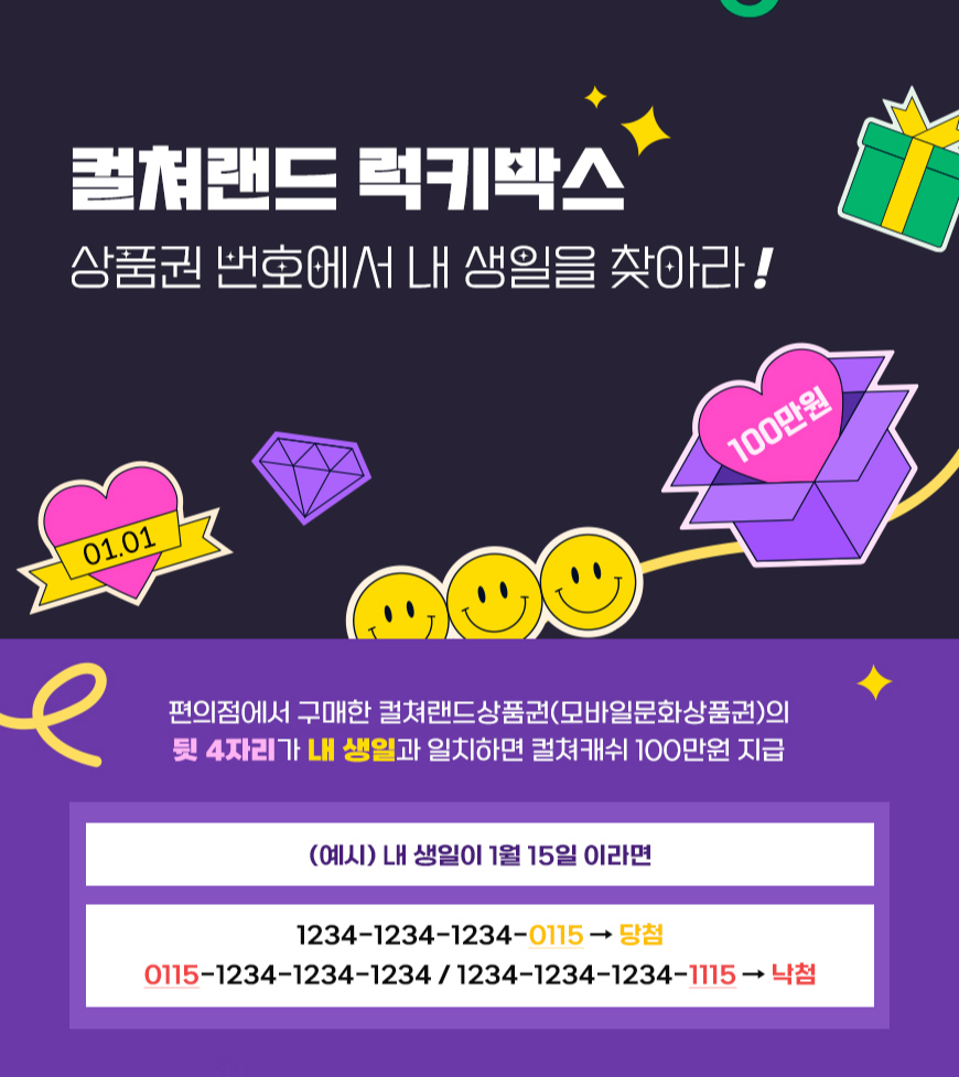 컬쳐랜드 럭키박스 이벤트도 상시로 진행 중입니다. 편의저메서 구매한 켤쳐랜드상품건의 뒷4자리가 내 생일과 일치하면 컬쳐캐쉬 100만원을 지급하는 이벤트로, 본인의 생일이 3월 15일이라면 컬쳐캐쉬상품권 뒷자리가 0315로 끝나면 당첨되는 이벤트입니다. 당첨이 되었을 경우 충전 후 1개월내 고객센터로 인증해야만 켤쳐캐쉬 100만원이 지급되니 편의점에서 컬쳐캐쉬상품권 구매시 뒷 4자리가 내생일과 일치하는지 꼭 챙겨보시기 바랍니다.