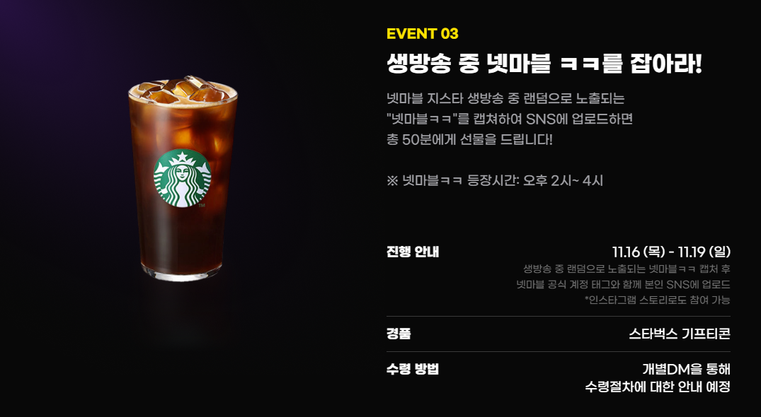 넷마블 지스타 생방송 중 랜덤으로 노출되는 넷마블ㅋㅋ 를 캡처해 SNS에 업로드하면 스타벅스 기프티콘이 선물로 주어지는 넷마블ㅋㅋ 이벤트도 준비되어 있습니다. 오후 2시~4시 사이에 등장한다고 하는데요, 총 50명에게 선물로 지급한다고 하니 가벼운 마음으로 참여하고 선물도 받아보시기 바랍니다.