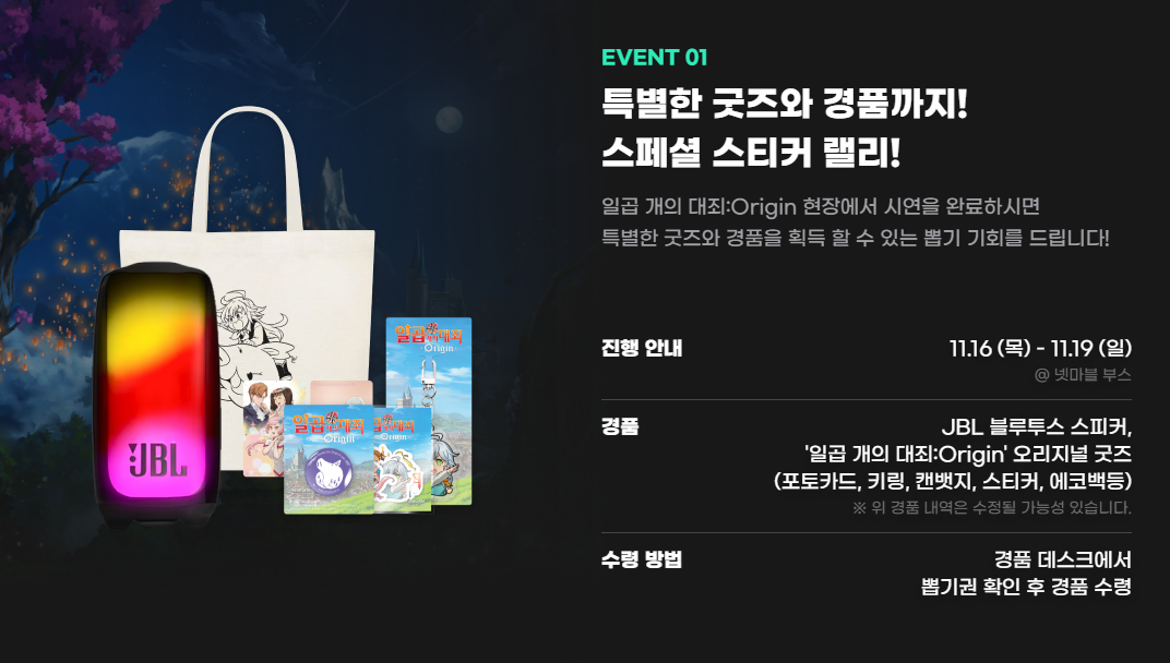 일곱 개의 대죄: 오리진 게임 부스에서 진행되는 이벤트도 풍성합니다. 넷마블 부스에서 시연을 완료하거나, 오픈 월드 모드에서 회색 마신을 잡으면 주어지는 경품도 상당한데요, 무엇보다 매일 최고기록 TOP3에게는 플레이스테이션 5 또는 게이밍 기어등의 선물이 주어집니다.