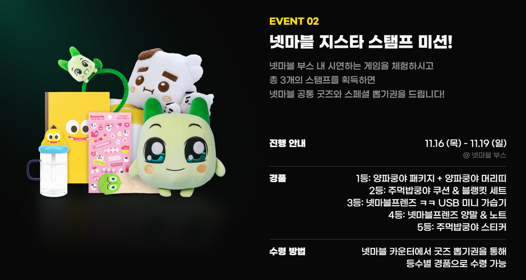 행사가 진행되는 동안 넷마블 부스 내 시연하는 게임을 체험하고 총 3개의 스탬프를 획득하면 넷마블 공통 굿즈와 스페셜 뽑기권 획득이 가능합니다. 뽑기권으로 획득할 수 있는 선물도 어마어마한데요, 양파쿵야 패키지와 양파쿵야머리띠 선물을 비롯해 다양한 굿즈 선물까지 풍성하게 준비되어 있어 도전해 볼 만합니다.