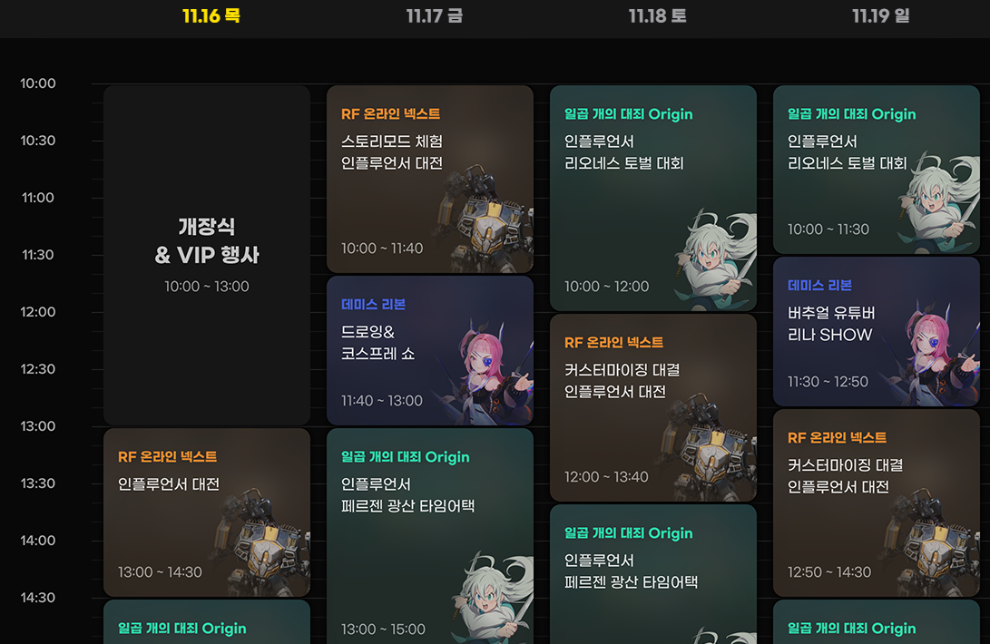 행사가 진행되는 넷마블 부스는 제1전시장 BTC관내 A04부스에 자리잡고 있는데요, 11월 16일 개장식을 시작으로 출품한 세 게임의 시연과 대외 그리고 코스프레쇼까지 3일을 꽉꽉 채운 행사들이 준비되어 있어 행사 기간 내내 넷마블 부스에서 시간을 보내도 부족할 정도입니다.