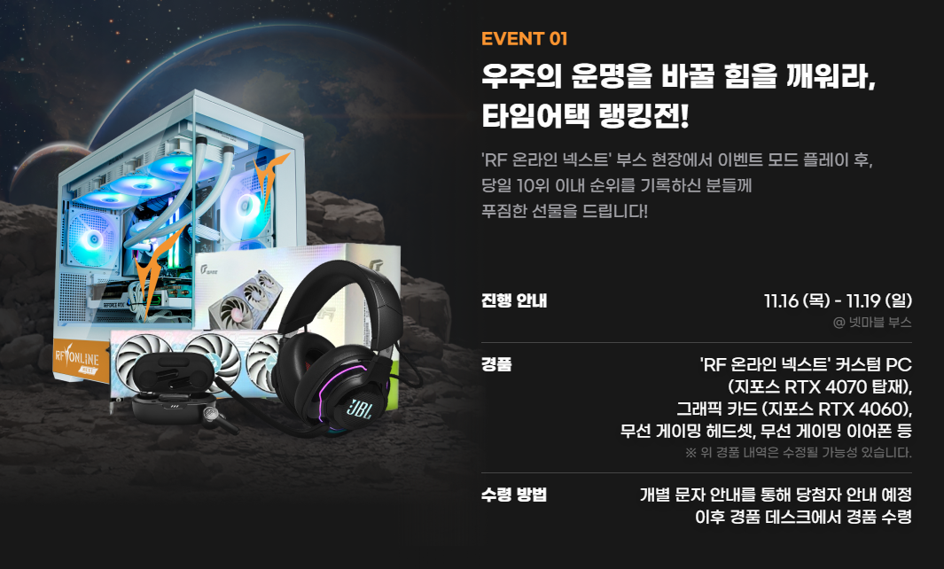 지스타 2023 넷마블 부스에서 시연 가능한 게임 플레이를 즐기고 참여가능한 이벤트도 준비되어 있습니다. RF 온라인 넥스트 부스 현장에서 이벤트 모드를 플레이한 후 당일 10의 이내 순위를 기록한 인원에게는 RF온라인 넥스트 커스텀 PC를 비롯해 무선 게이밍 헤드셋등 선물을 수령할 수 있습니다. 또한 시연모드를 플레이한 모든 유저에게 즉석 행원권 뽑기 기회가 주어지는데요, 그래픽카드를 비롯해 JBL 블루투스 스피커등 선물이 준비되어 있어 꼭 참여해 보시길 추천드립니다.