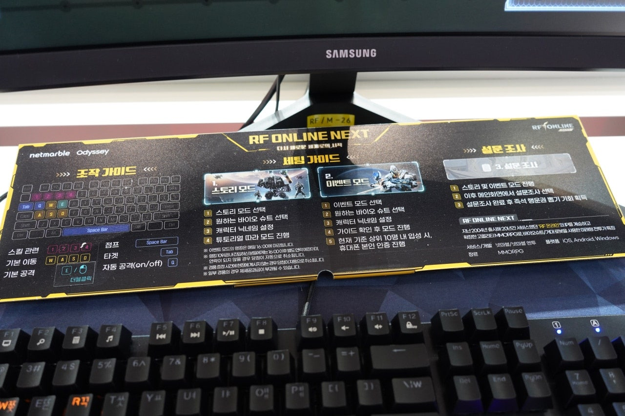 시연대 모니터 밑에는 RF 온라인 넥스트를 즐기는데 필요한 조작 가이드롸 세팅가이드가 준비되어 있어 원하는 모드를 선택해 할 수 있었는데요, 스토리모드와 이벤트 모드 모두 시연이 가능한 점이 인상적이었습니다.