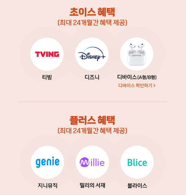 KT다이렉트 요금제를 통해 선택 가능한 혜택을 살펴보면 초이스 혜택과 플러스 혜택으로 구성되어 있어 원하는 혜택 선택이 가능한데요, 전자책어플 밀리의서재 혜택을 최대 24개월간 제공하고 있어 평소 스마트폰으로 전자책을 즐겨 읽는 분들에게는 이보다 더 좋은 혜택은 없는 듯 합니다.