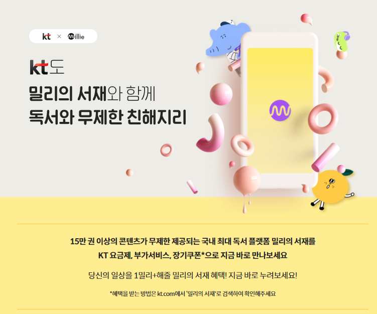 전자책어플 밀리의 서재는 국내 최대 전자책 플랫폼으로 15만 권이라는 엄청난 숫자의 독서 콘텐츠를 언제 어디서나 무제한으로 즐길 수 있는데요, KT다이렉트 요금제를 이용하면 초이스 혜택 한가지와 플러스 혜택에서 밀리의 서재를 선택 최대 24개월간 무제한 이용이 가능합니다.