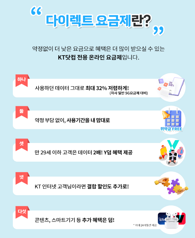 최근 5 G 요금제로 변경하면서 KT다이렉트 요금제를 알게 되었는데요, 데이터와 통화 및 문자는 기본, 다양한 결합할인을 묶어 다양한 혜택을 선택할 수 있는 점이 특징입니다. 특히 다이렉트 요금제는 오직 KT닷컴에서만 약정 없이 요금은 최대 32% 더 낮게 혜택은 더 많이 받을 수 있어 많은 분들이 선택하고 있기도 합니다.