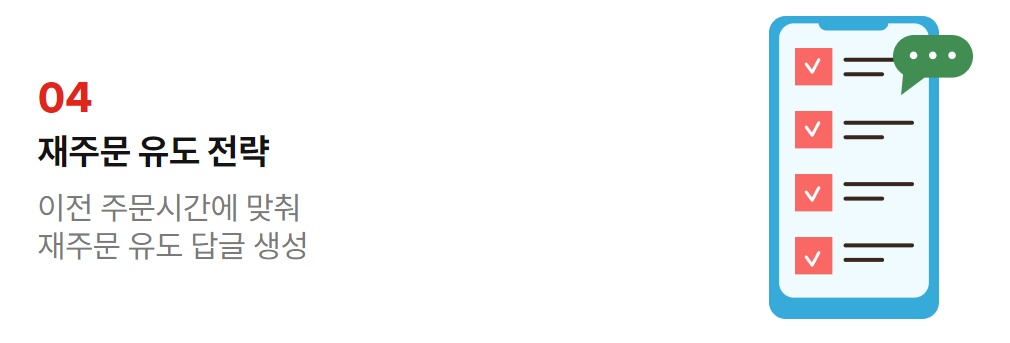 리뷰를 관리하는 이유. 주문을 늘려 매출을 올리기 위함인데요, 리뷰똑똑은 재주문 유도 전략으로 이전 주문시간에 맞춰 재주문 유도 답글을 생성해 단골 고객이 될 수 있도록 전략적인 관리를 진행합니다. 필요한 순간 알람을 통해 자연스럽게 주문으로 이어지고, 이렇게 단골 고객이 되는것 아니겠어요?